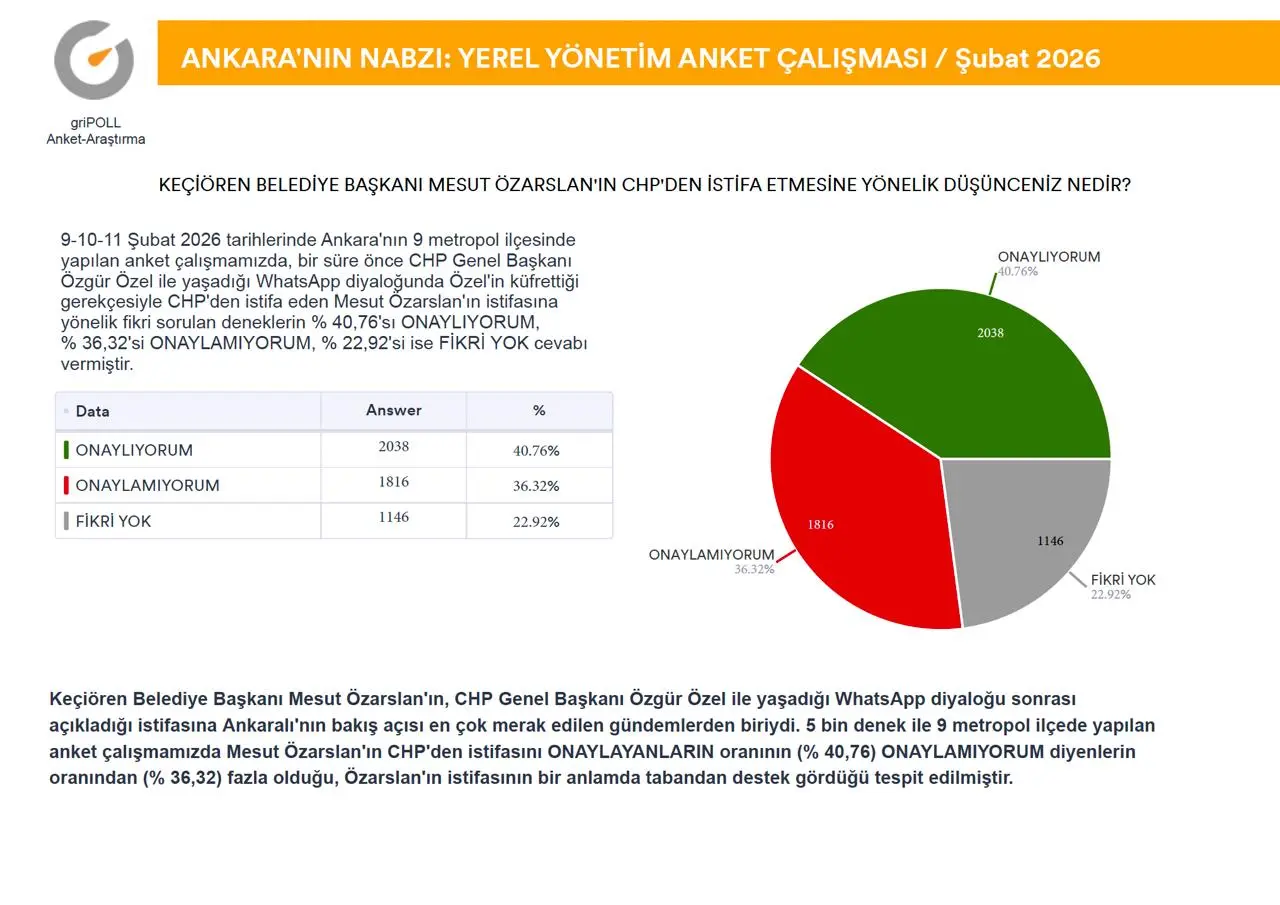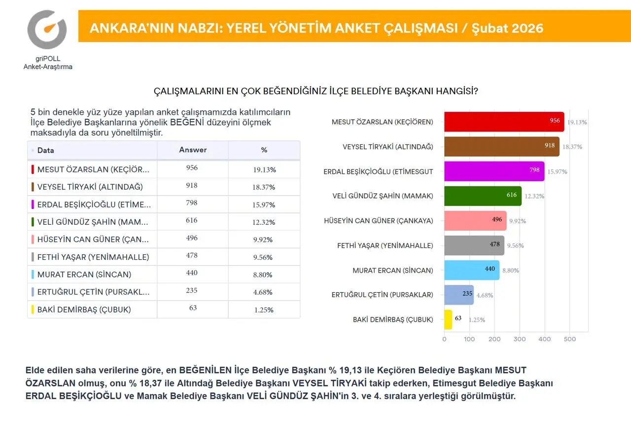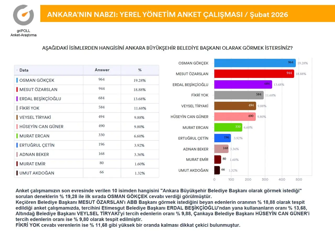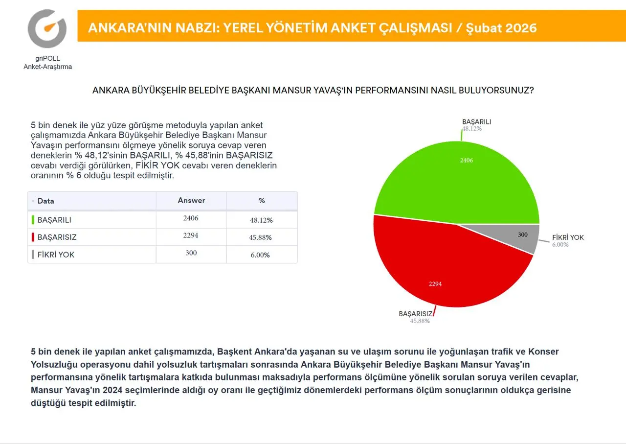 griPOLL Anket Araştırma’nın “Ankara’nın Nabzı” anket çalışması tamamlandı.Ankara Büyükşehir Belediye Başkanı Mansur Yavaş’ın güncel performansı ile Keçiören Belediye Başkanı Mesut Özarslan’ın partisinden istifa etmesi sonrasında, kamuoyunda devam eden tartışmalara katkı sağlamak maksadıyla, 9-11 Şubat (2026) tarihleri arasında, Ankara’nın 9 metropol ilçesinde (Altındağ, Çankaya, Çubuk, Etimesgut, Keçiören, Mamak, Pursaklar, Sincan, Yenimahalle) 5.000 (BEŞBİN) denek ile yüz yüze görüşme metoduyla yapılan anket çalışma ayrıntılı raporu ekli sayfalarda açıklamalı grafikler halinde sunuldu.
