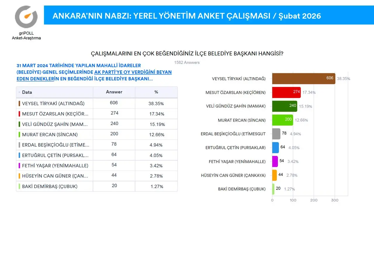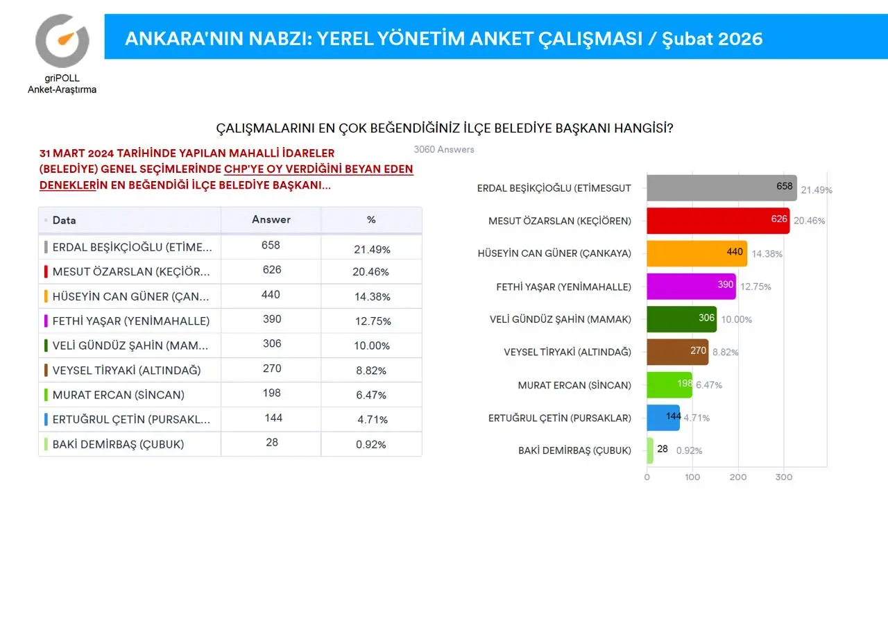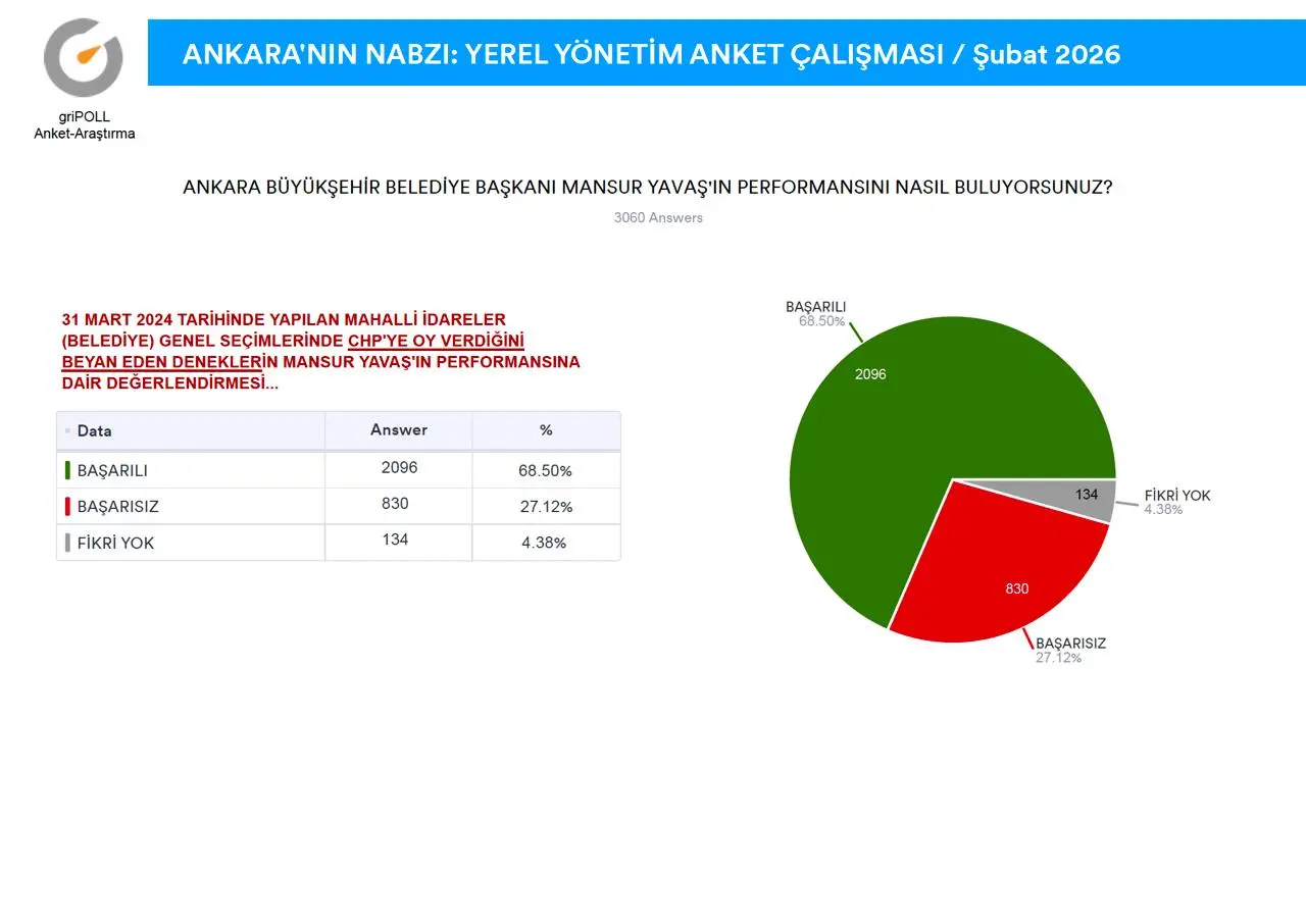 griPOLL Anket Araştırma’nın “Ankara’nın Nabzı” anket çalışması tamamlandı.Ankara Büyükşehir Belediye Başkanı Mansur Yavaş’ın güncel performansı ile Keçiören Belediye Başkanı Mesut Özarslan’ın partisinden istifa etmesi sonrasında, kamuoyunda devam eden tartışmalara katkı sağlamak maksadıyla, 9-11 Şubat (2026) tarihleri arasında, Ankara’nın 9 metropol ilçesinde (Altındağ, Çankaya, Çubuk, Etimesgut, Keçiören, Mamak, Pursaklar, Sincan, Yenimahalle) 5.000 (BEŞBİN) denek ile yüz yüze görüşme metoduyla yapılan anket çalışma ayrıntılı raporu ekli sayfalarda açıklamalı grafikler halinde sunuldu.