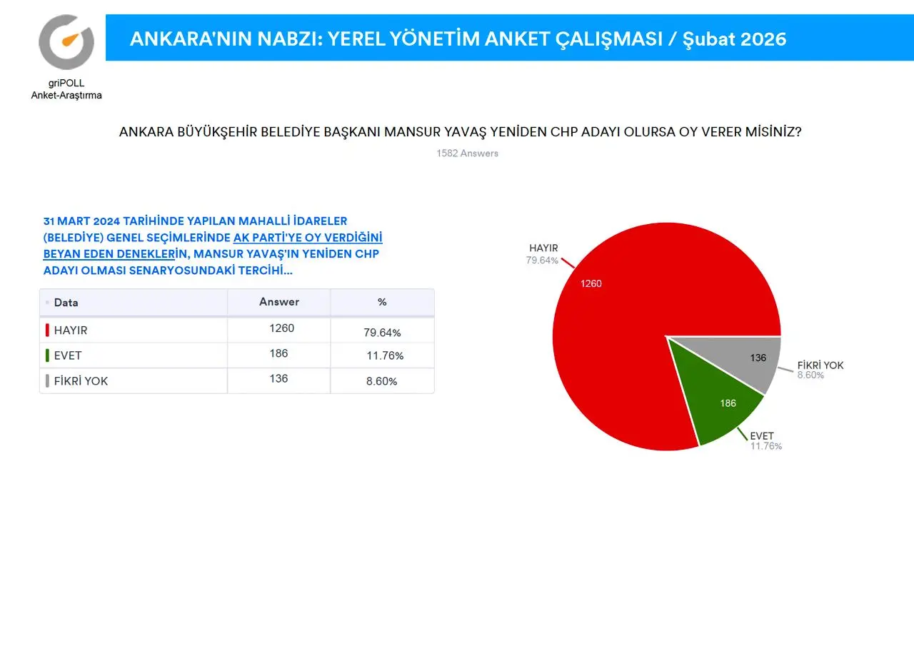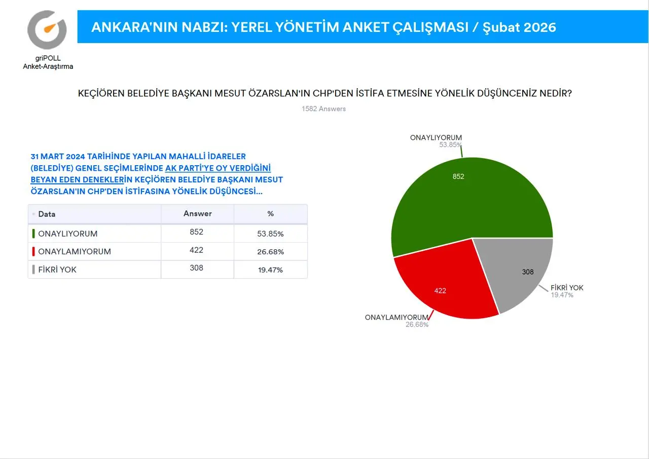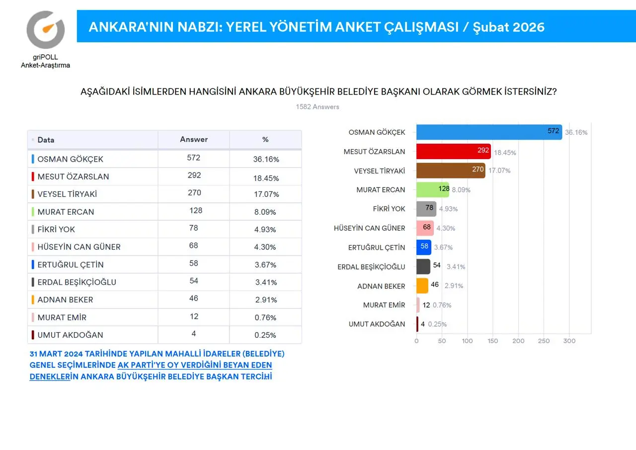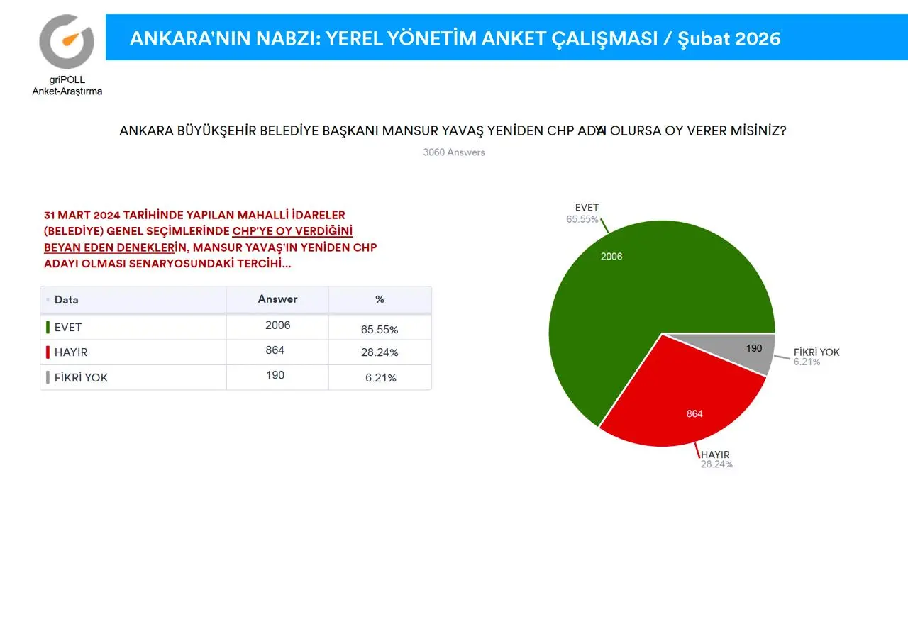 griPOLL Anket Araştırma’nın “Ankara’nın Nabzı” anket çalışması tamamlandı.Ankara Büyükşehir Belediye Başkanı Mansur Yavaş’ın güncel performansı ile Keçiören Belediye Başkanı Mesut Özarslan’ın partisinden istifa etmesi sonrasında, kamuoyunda devam eden tartışmalara katkı sağlamak maksadıyla, 9-11 Şubat (2026) tarihleri arasında, Ankara’nın 9 metropol ilçesinde (Altındağ, Çankaya, Çubuk, Etimesgut, Keçiören, Mamak, Pursaklar, Sincan, Yenimahalle) 5.000 (BEŞBİN) denek ile yüz yüze görüşme metoduyla yapılan anket çalışma ayrıntılı raporu ekli sayfalarda açıklamalı grafikler halinde sunuldu.