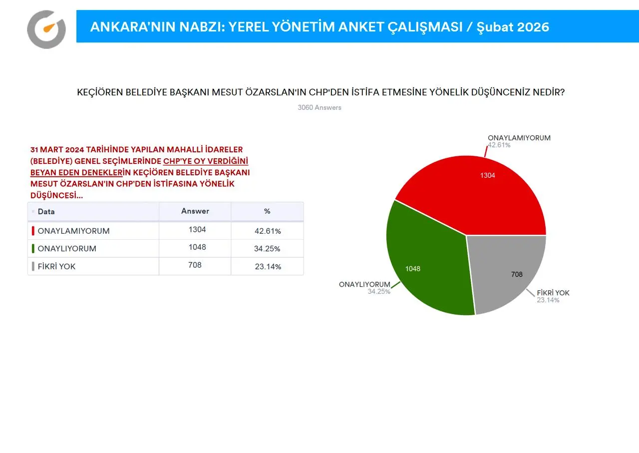31 Mart 2024 tarihli Belediye seçiminde CHP’ye oy verdiğini beyan eden denekler, “KEÇİÖREN BELEDİYE BAŞKANI MESUT ÖZARSLAN'IN CHP'DEN İSTİFA ETMESİNE YÖNELİK DÜŞÜNCENİZ NEDİR?” şeklindeki soruya;