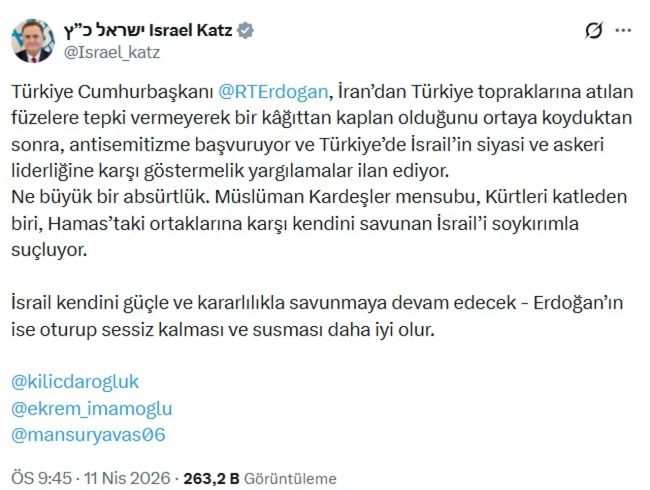 İsrail Savunma Bakanı Katz da, alçakça iftiralar üzerinden Başkan Erdoğan'ı hedef aldı. Katz ayrıca paylaşımına Kemal Kılıçdaoroğlu, Ekrem İmamoğlu ve Mansur Yavaş'ı etiketledi.