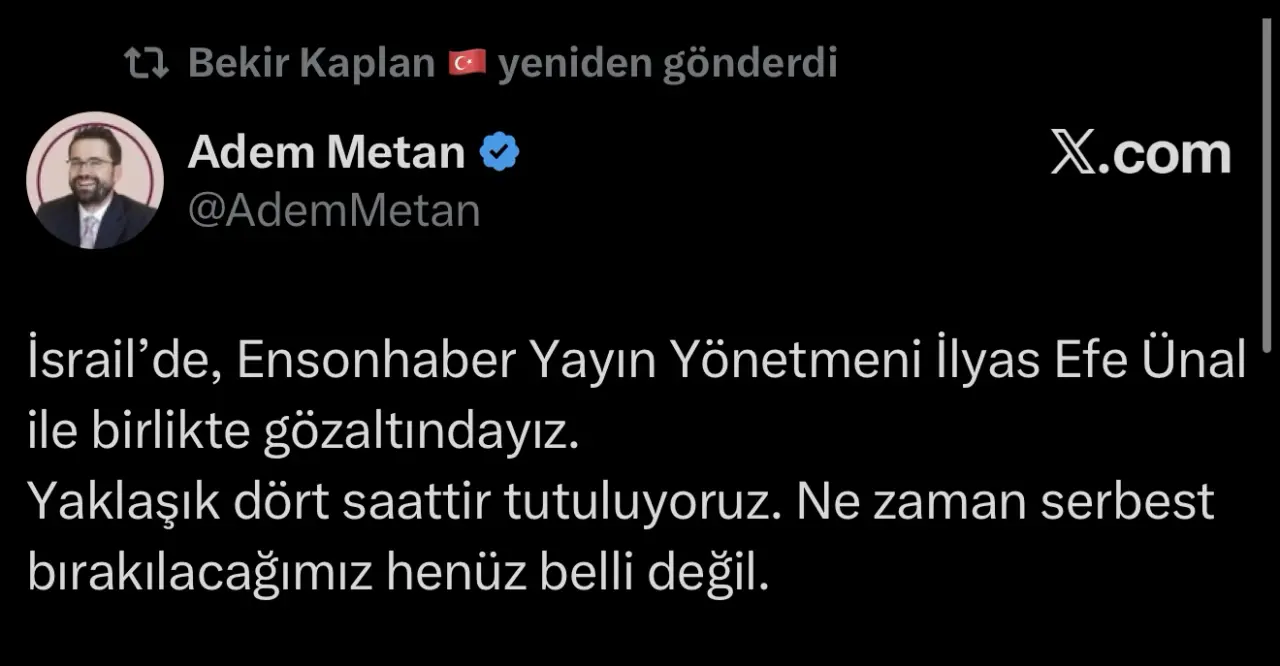 Ensonhaber Genel Yayın Yönetmeni İlyas Efe Ünal, İsrail'de Ensonhaber Yazarı Adem Metan ile beraber gözaltına alındı. Sosyal medya hesabı üzerinden bir paylaşım yapan Metan, 4 saattir gözaltına tutulduklarını belirtti.