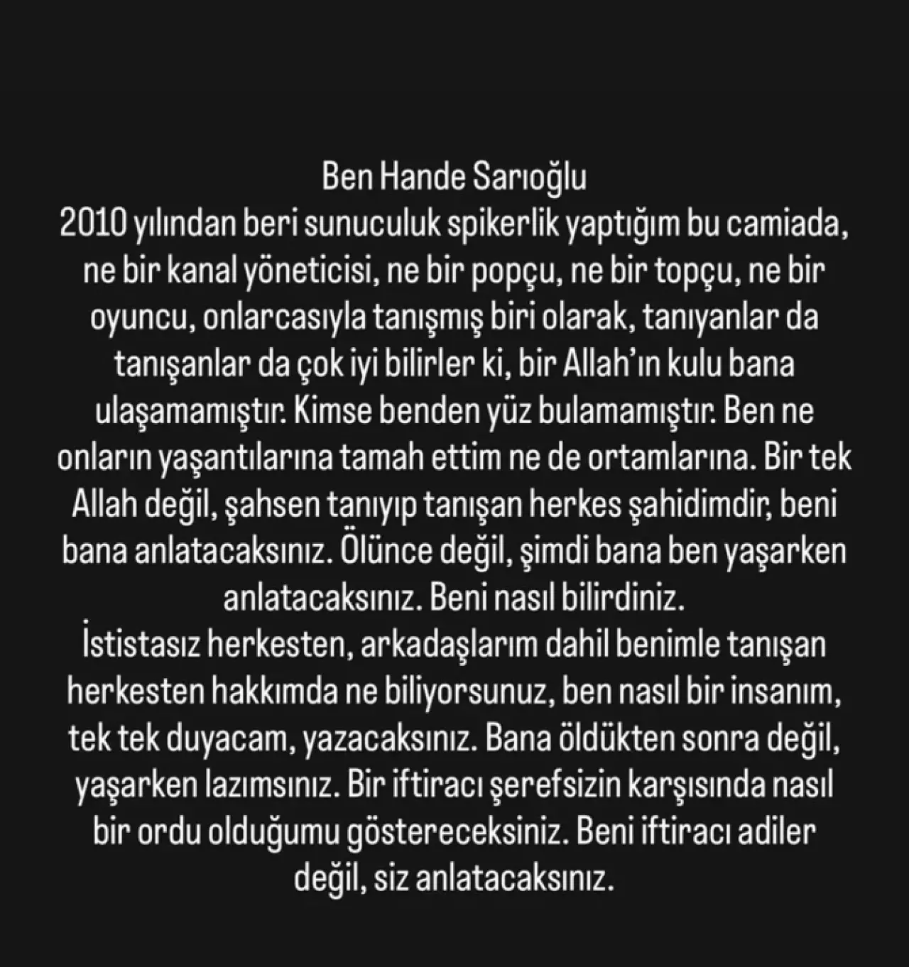 "Ben Hande Sarıoğlu 2010 yılından beri sunuculuk spikerlik yaptığım bu camiada, ne bir kanal yöneticisi, ne bir popçu, ne bir topçu, ne bir oyuncu, onlarcasıyla tanışmış biri olarak, tanıyanlar da tanışanlar da çok iyi bilirler ki, bir Allah'ın kulu bana ulaşamamıştır. Kimse benden yüz bulamamıştır. Ben ne onların yaşantılarına tamah ettim ne de ortamlarına. Bir tek Allah değil, şahsen tanıyıp tanışan herkes şahidimdir, beni bana anlatacaksınız. Ölünce değil, şimdi bana ben yaşarken anlatacaksınız. Beni nasıl bilirdiniz. İstistasız herkesten, arkadaşlarım dahil benimle tanışan herkesten hakkımda ne biliyorsunuz, ben nasıl bir insanım, tek tek duyacam, yazacaksınız. Bana öldükten sonra değil, yaşarken lazımsınız. Bir iftiracı şerefsizin karşısında nasıl bir ordu olduğumu göstereceksiniz. Beni iftiracı adiler değil, siz ''BEN ÖLMEDEN ADIMDAN HELALLİK ALACAKSINIZ''