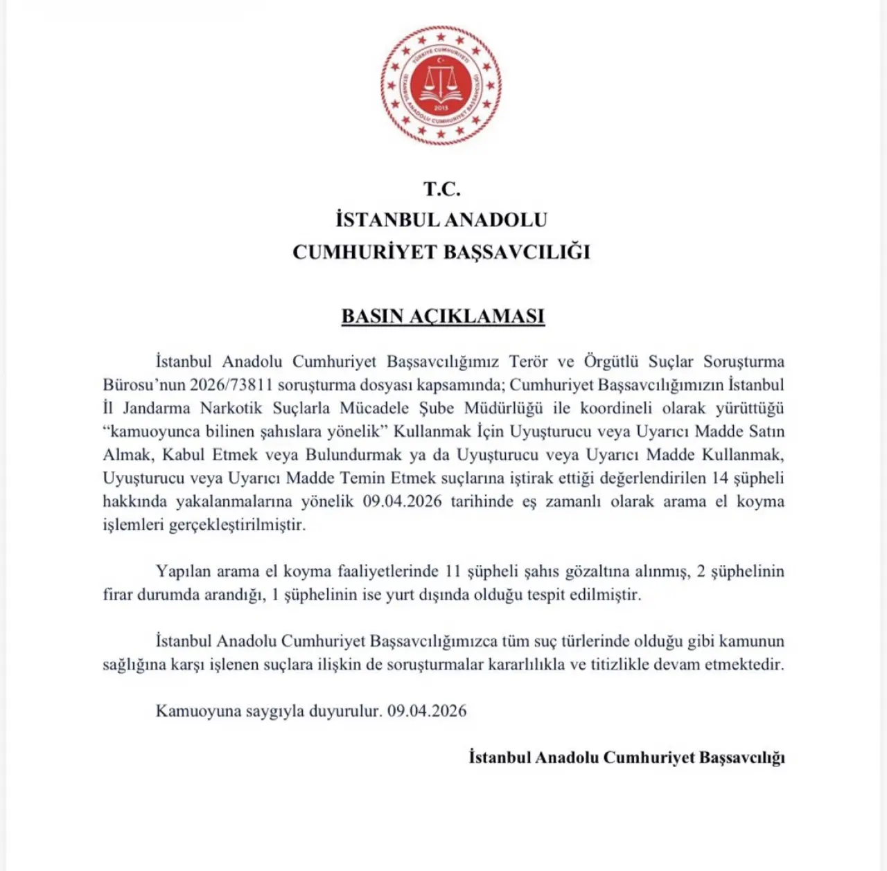 Bürosu’nun 2026/73811 soruşturma dosyası kapsamında; Cumhuriyet Başsavcılığımızın İstanbul İl Jandarma Narkotik Suçlarla Mücadele Şube Müdürlüğü ile koordineli olarak yürüttüğü “kamuoyunca bilinen şahıslara yönelik” Kullanmak İçin Uyuşturucu veya Uyarıcı Madde Satın Almak, Kabul Etmek veya Bulundurmak ya da Uyuşturucu veya Uyarıcı Madde Kullanmak, Uyuşturucu veya Uyarıcı Madde Temin Etmek suçlarına iştirak ettiği değerlendirilen 14 şüpheli hakkında yakalanmalarına yönelik 09.04.2026 tarihinde eş zamanlı olarak arama el koyma işlemleri gerçekleştirilmiştir.
