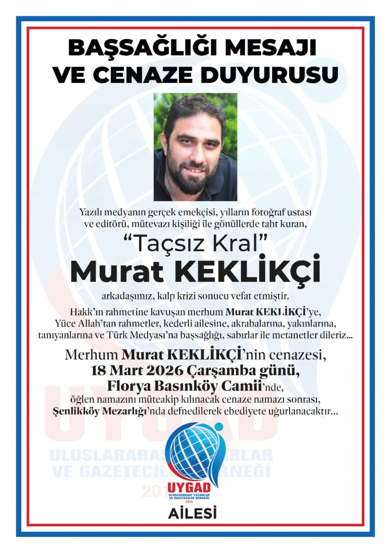 Murat Keklikçi'nin cenazesi, 18 Mart Çarşamba günü (yarın) Basınköy Camii'nde öğle namazını müteakiben kılınacak cenaze namazının ardından Şenlikköy Mezarlığı'nda toprağa verilecek.