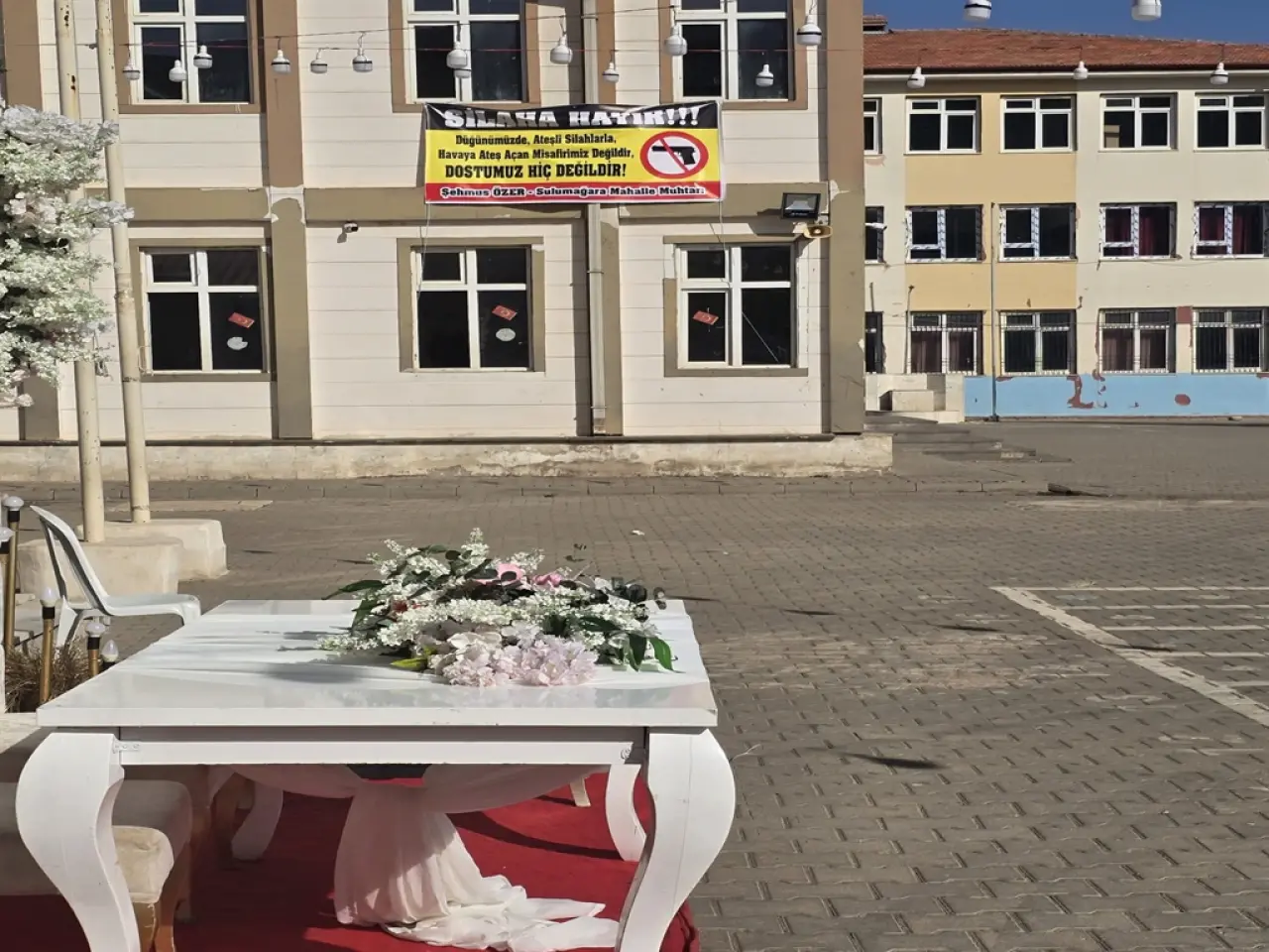 Düğünde havaya silahla ateş edilmesini önlemek için, ‘Silaha hayır, düğünümüzde ateşli silahlarla havaya ateş açan misafirimiz değildir, dostumuz hiç değildir' yazılı pankart alana asıldı. Pankartı gören davetliler ise uyarıyı dikkate alıp, silahla ateş açmadı