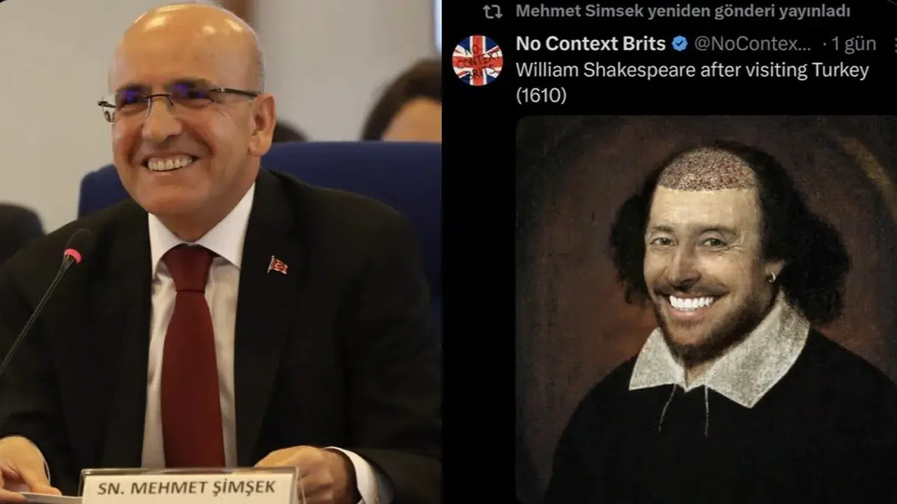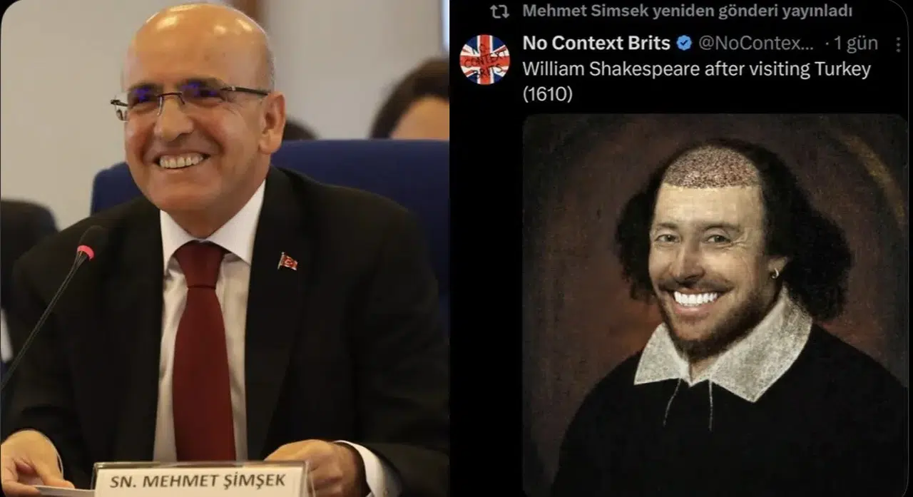 Şimşek’in retweet ettiği gönderide, yabancıların Türkiye ziyaretlerinde saç ektirmesine gönderme yapılarak, “William Shakespeare, Türkiye ziyaretinden sonra (1610)” ifadesi kullanıldı.