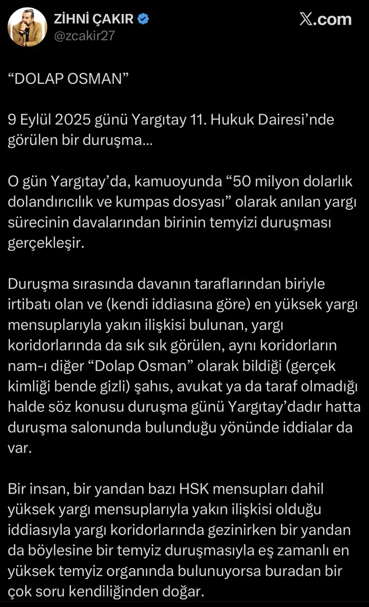 Çakır, paylaşımlarında Abdullah Yaman hakkında çeşitli iddiaları gündeme getirerek konuyla ilgili suç duyurularında bulunduğunu ifade etti.