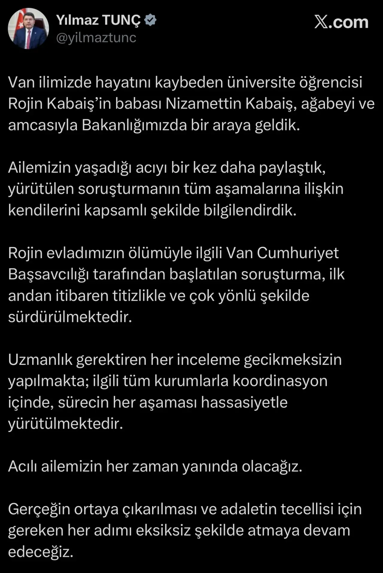 Adalet Bakanı Yılmaz Tunç,baba Nizamettin Kabaiş ile görüşme sonrası,sosyal medya hesabı üzerinden bir açıklama yaptı. Bakan Tunç’un açıklaması şöyle;