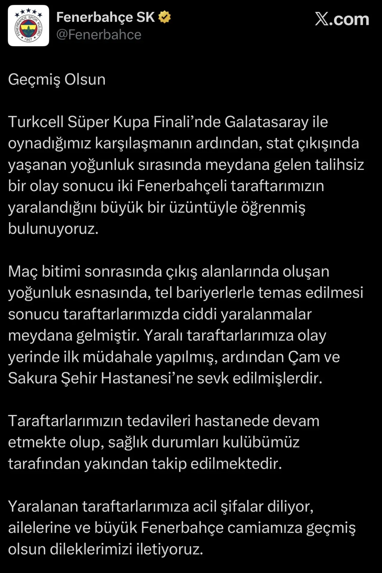 Turkcell Süper Kupa Finali’nde Galatasaray ile oynadığımız karşılaşmanın ardından, stat çıkışında yaşanan yoğunluk sırasında meydana gelen talihsiz bir olay sonucu iki Fenerbahçeli taraftarımızın yaralandığını büyük bir üzüntüyle öğrenmiş bulunuyoruz.