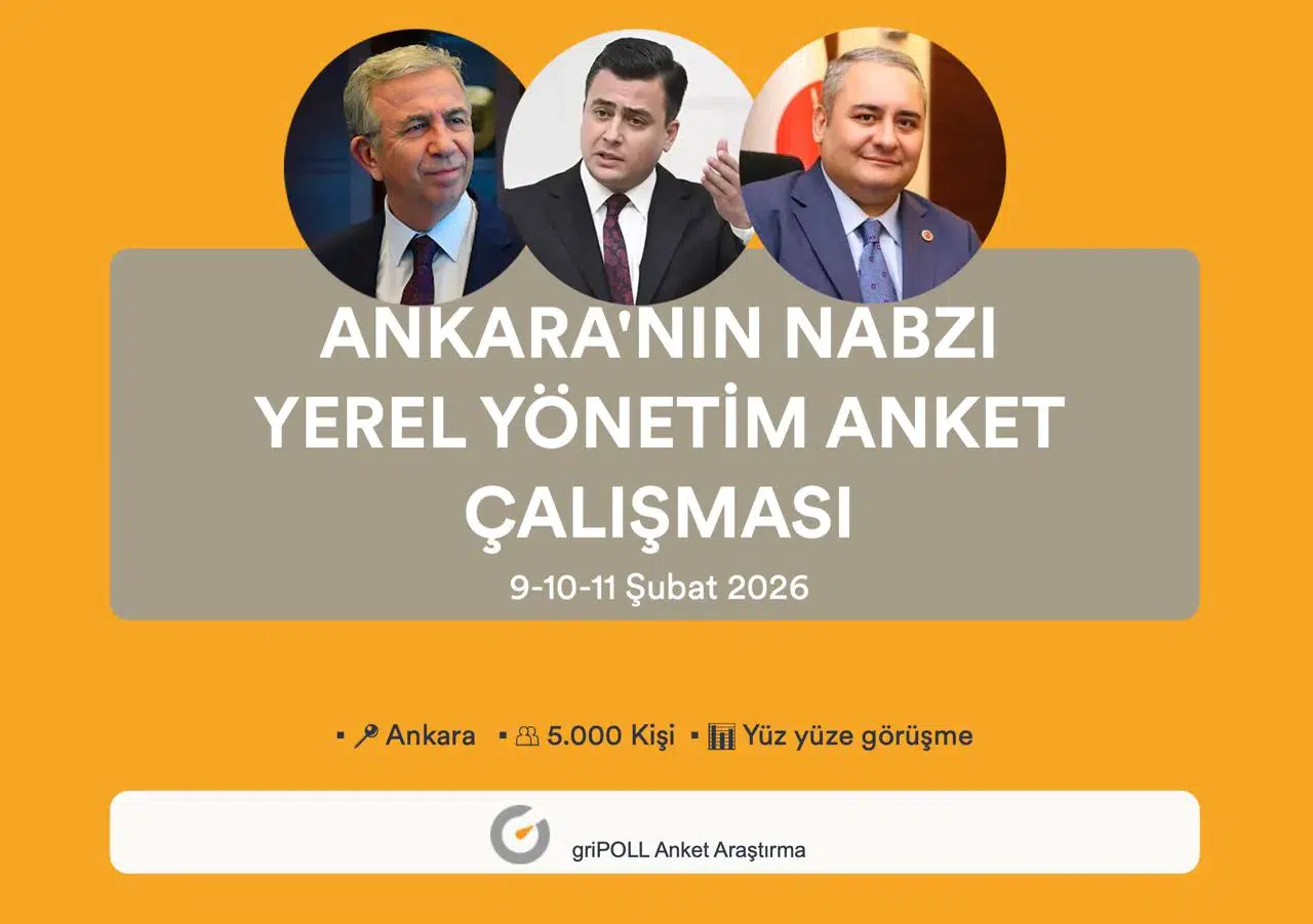 griPOLL Anket Araştırmanın “Ankara’nın Nabzı” anket çalışması tamamlandı.Ankara Büyükşehir Belediye Başkanı Mansur Yavaş’ın güncel performansı ile Keçiören Belediye Başkanı Mesut Özarslan’ın partisinden istifa etmesi sonrasında, kamuoyunda devam eden tartışmalara katkı sağlamak maksadıyla, 9-11 Şubat (2026) tarihleri arasında, Ankara’nın 9 metropol ilçesinde (Altındağ, Çankaya, Çubuk, Etimesgut, Keçiören, Mamak, Pursaklar, Sincan, Yenimahalle) 5.000 (BEŞBİN) denek ile yüz yüze görüşme metoduyla yapılan anket çalışma ayrıntılı raporu ekli sayfalarda açıklamalı grafikler halinde sunuldu.