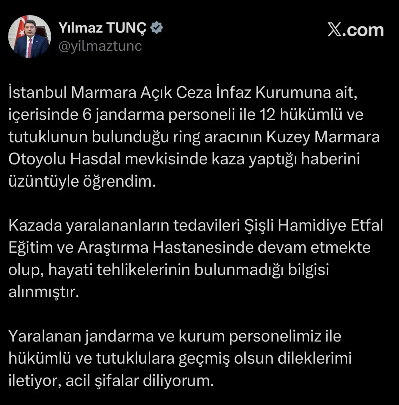 “İstanbul Marmara Açık Ceza İnfaz Kurumuna ait, içerisinde 6 jandarma personeli ile 12 hükümlü ve tutuklunun bulunduğu ring aracının Kuzey Marmara Otoyolu Hasdal mevkisinde kaza yaptığı haberini üzüntüyle öğrendim.