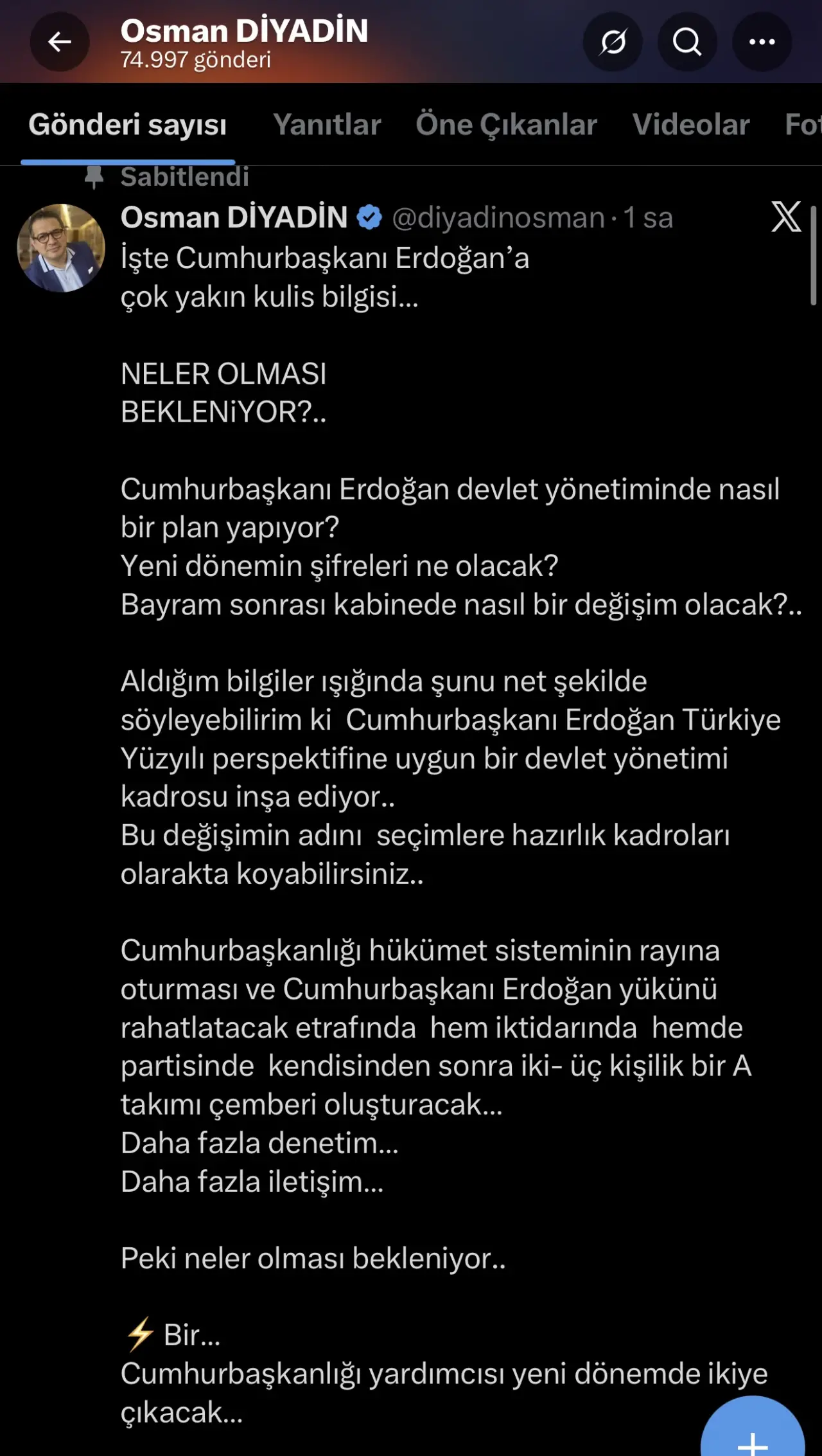 Diyadin bir sonra ki mesajında ise,”İşte Cumhurbaşkanı Erdoğan’a çok yakın kulis bilgisi…” yazarak,şu çok konuşulacak cümlelerin sıraladı.