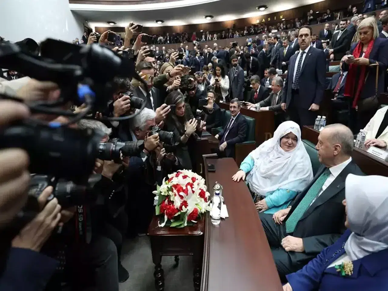 Cumhurbaşkanı Erdoğan, TBMM'de partisinin grup toplantısında konuştu. Erdoğan, salona girişinde kıyafeti üzerinden hedef alınan Eskişehir Mihalgazi Belediye Başkanı Zeynep Güneş Akgün ve onunla birlikte gelen 100 kadın ile milletvekilleri ve partililer tarafından ayakta alkışlandı. Erdoğan, Mihalgazi Belediye Başkanı Akgün ile aynı kıyafeti giyen beyaz tülbentli kadınları selamlayarak kürsüye çıktı. Erdoğan, "Bir asır önce İstiklal Harbimizde olduğu gibi beyaz örtmelerini takıp, şalvarlarını giyerek Eskişehir Mihalgazi'den grup salonumuzu teşrif eden Belediye Başkanımız Zeynep Güneş'le birlikte tüm hanım kardeşlerime teşekkür ediyor, Anadolu kadınının bin yıllık asaletini yansıtan şu vakur duruşları için kendilerine şükranlarımı sunuyorum. Milletten aldığı yetkiyle ilçesine 3 dönemdir hizmet eden başarılı bir kadın siyasetçiyi, 'şalvarlı kadının görevi ilçe yönetmek değildir, ahırda inek sağmaktır' diyerek tahkir etmeye kalkan 28 Şubat artığı bu faşizan, bu ukala, kibirli, alçak zihniyeti bugün bir kez daha lanetliyorum. Yıllarca sırf başörtülerinden ötürü kadınların eğitim hakkını, kamuda çalışma hakkını, hatta seçilme hakkını gasbedenlerle, Anadolu kadınının asırlardır üzerinde gururla taşıdığı yazmasına, tülbendine, şalvarına, çarşafına, ehramına, fistanına dil uzatanlarla, milletimize tepeden bakan, milletimizi hor ve hakir görenlerle mücadelemizi her zeminde sonuna kadar devam ettireceğimizin bilinmesini istiyorum. Bu ülkede yasakçı ve baskıcı anlayışa göz yummadık ve yummayacağız. Kadınlara parmak sallayanlara meydanı terk etmedik, etmeyeceğiz. Eski karanlık günleri hortlatmaya çalışanların karşısında dimdik durduk, duracağız. Şerife Bacının, Kara Fatma'nın, Nene Hatun'un yolundan giden tüm hanım kardeşlerimi bugün bir kere daha kemali hürmetle selamlıyorum. Rabb’im salonlara sığmayan şu muhabbetimizi daim eylesin" dedi.