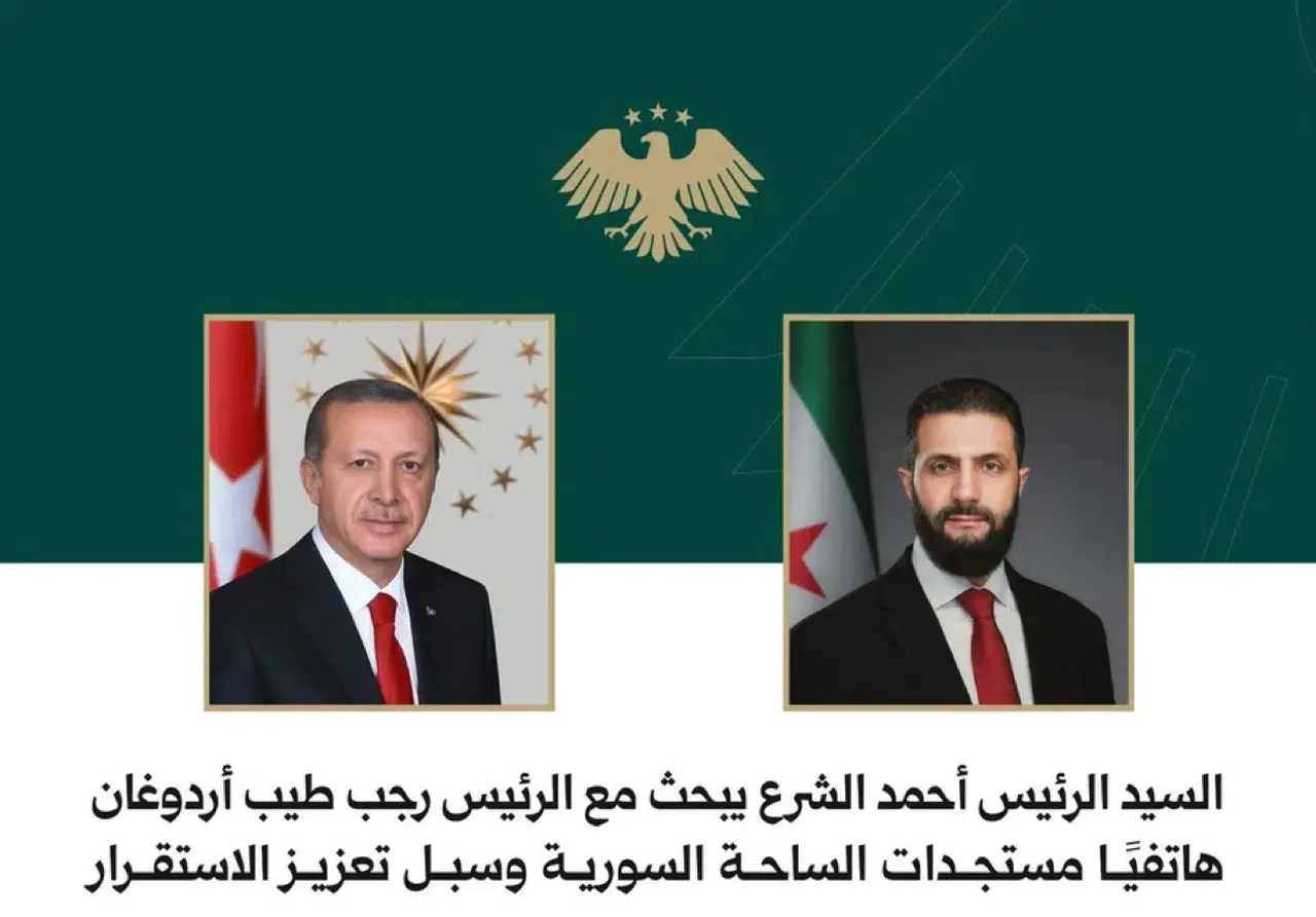 “Cumhurbaşkanı Ahmed eş-Şara, Cumhurbaşkanı Recep Tayyip Erdoğan ile Suriye sahasındaki son gelişmeleri ve istikrarı güçlendirme yollarını telefonla görüştü.