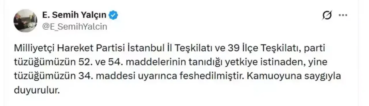 "Milliyetçi Hareket Partisi İstanbul İl Teşkilatı ve 39 İlçe Teşkilatı, parti tüzüğümüzün 52. ve 54. maddelerinin tanıdığı yetkiye istinaden, yine tüzüğümüzün 34. maddesi uyarınca feshedilmiştir. Kamuoyuna saygıyla duyurulur."