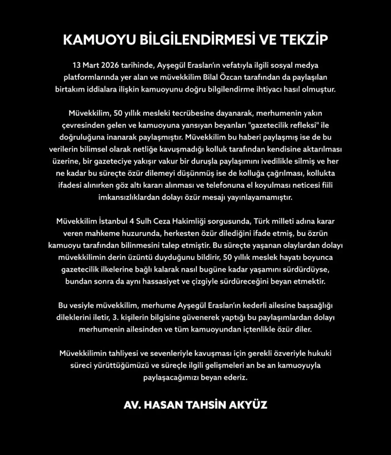 "Ayşegül Eraslan’ın ölümüyle ilgili haberinden dolayı gazeteci Bilal Özcan bugün 4. Sulh Ceza Hakimliği tarafından tutuklandı. Bilal Özcan’ın avukatı Hasan Tahsin Akyüz, Özcan’ın ‘yanıltıcı bilgiyi alenen yayma’ suçu işlediği iddiasıyla tutuklandığını söyledi. Avukat Hasan Tahsin Akyüz, konuyla ilgili ayrıntılı açıklama yapacağını belirtti."