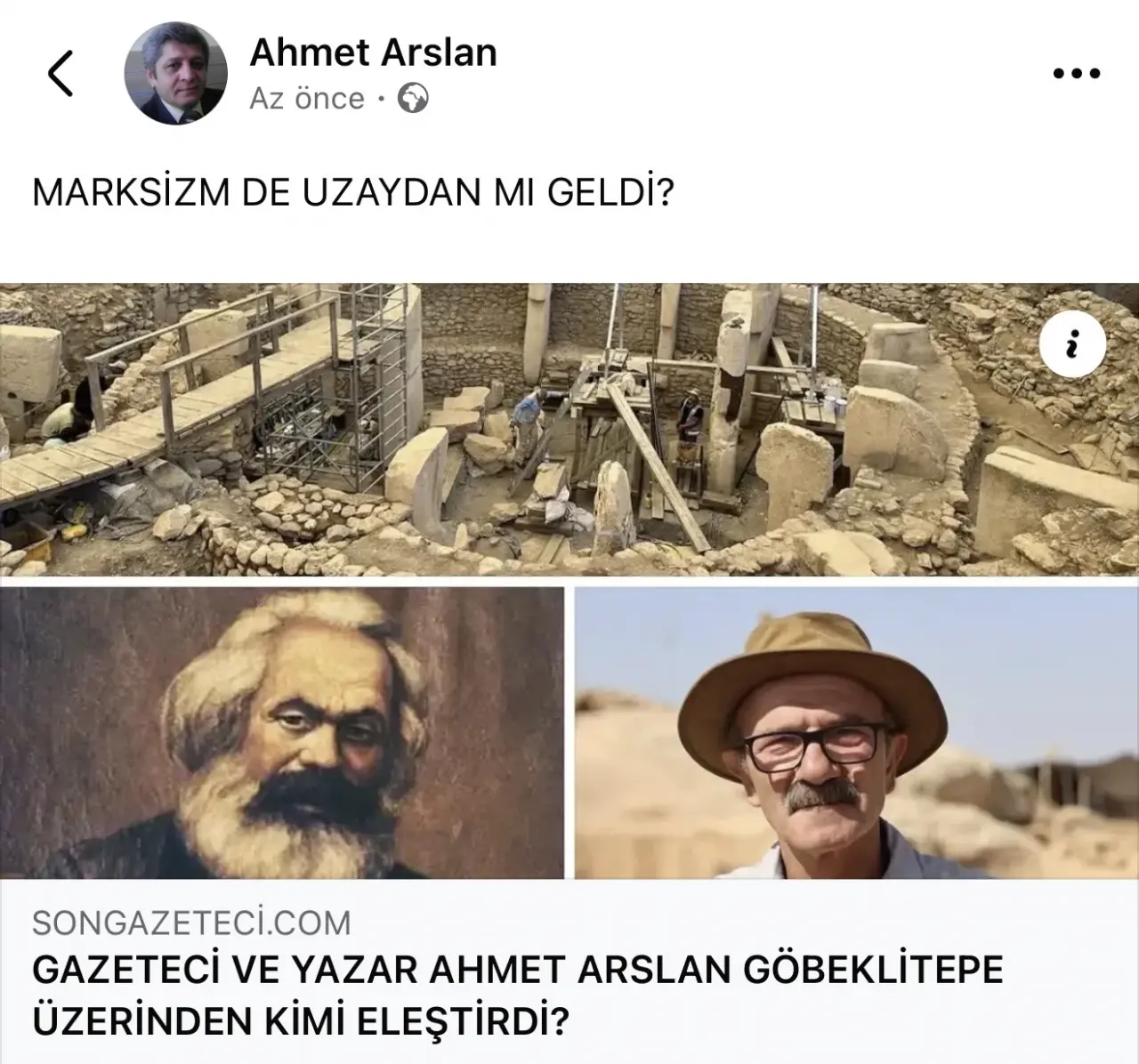 Göbeklitepe üzerine yapılan bir açıklama ile yazılan yazıda,Marksist düşünce yapısına sahip kişilerin tek taraflı ve kapalı ekosistem içinde olduklarının vurgulandığı, Ahmet Arslan’ın dikkat çeken yazısı ise şöyle;