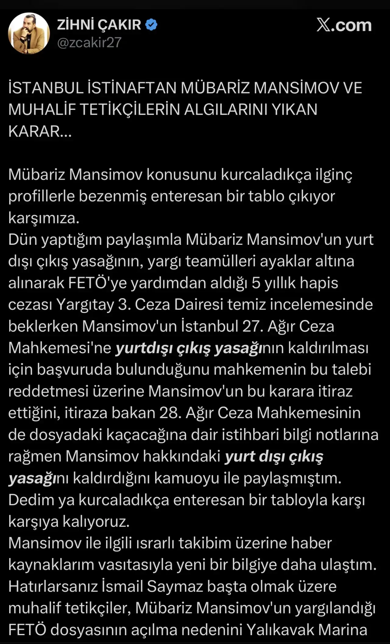 Dün yaptığım paylaşımla Mübariz Mansimov'un yurt dışı çıkış yasağının, yargı teamülleri ayaklar altına alınarak FETÖ'ye yardımdan aldığı 5 yıllık hapis cezası Yargıtay 3. Ceza Dairesi temiz incelemesinde beklerken Mansimov'un İstanbul 27. Ağır Ceza Mahkemesi'ne yurtdışı çıkış yasağının kaldırılması için başvuruda bulunduğunu mahkemenin bu talebi reddetmesi üzerine Mansimov'un bu karara itiraz ettiğini, itiraza bakan 28. Ağır Ceza Mahkemesinin de dosyadaki kaçacağına dair istihbari bilgi notlarına rağmen Mansimov hakkındaki yurt dışı çıkış yasağını kaldırdığını kamuoyu ile paylaşmıştım.