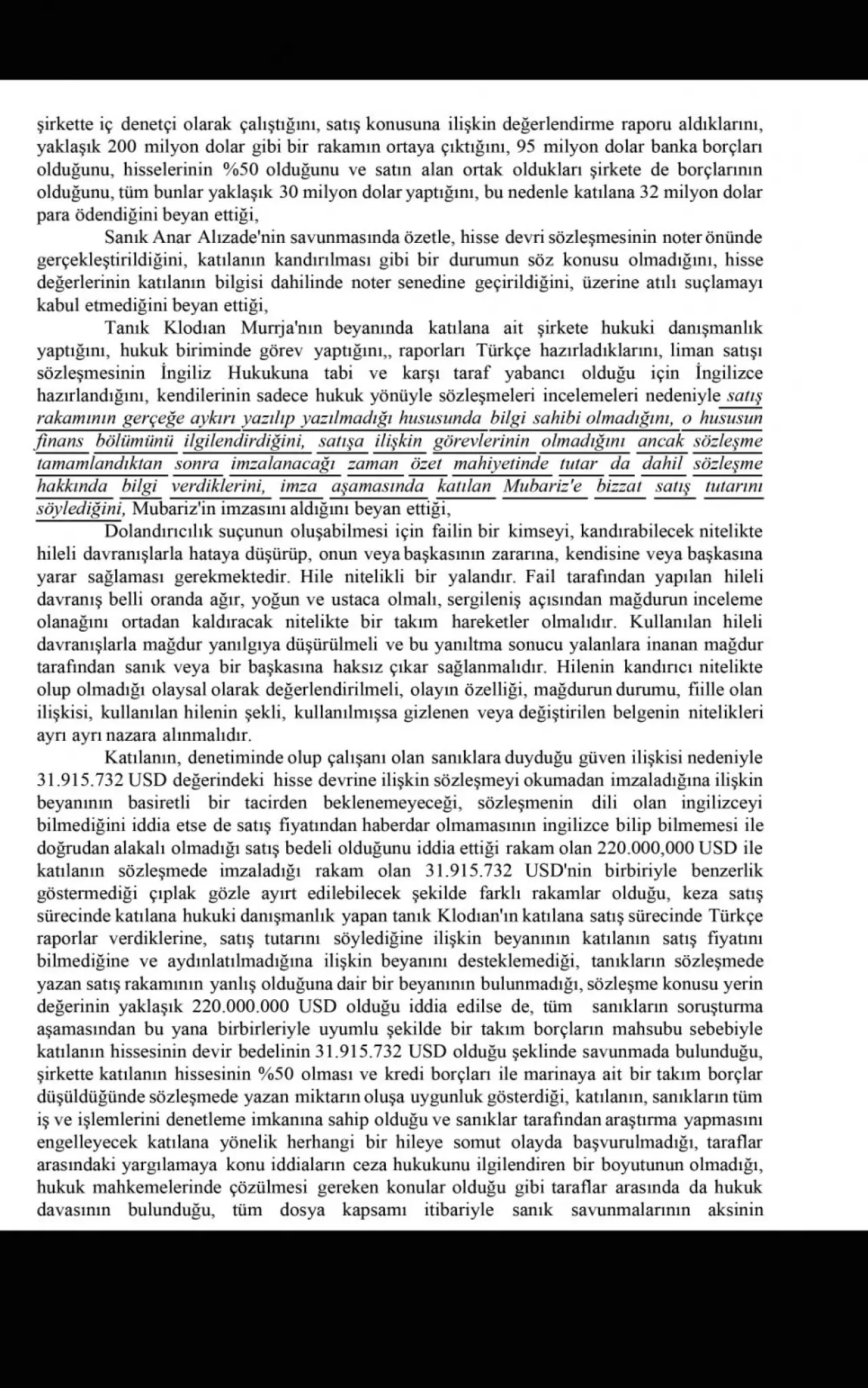 İstanbul 3. Ağır Ceza Mahkemesi kararını incelediğimizde Mansimov'un kendi avukatının ifadesinden, alım satımındaki tüm süreçlerin bilgisi dahilinde gerçekleştiği, sürekli haberdar edildiği görülüyor. Satışların da içinde bulunduğu ekonomik krizi açmak için değerinin çok üzerinde gerçekleştiği anlaşılıyor. Ayrıca Marina’yı satmış olduğu kişi ile eski çalışanlarının iş birliği yaptı yönündeki iddialar da yargılama sürecinden mesnetsiz kalmış.