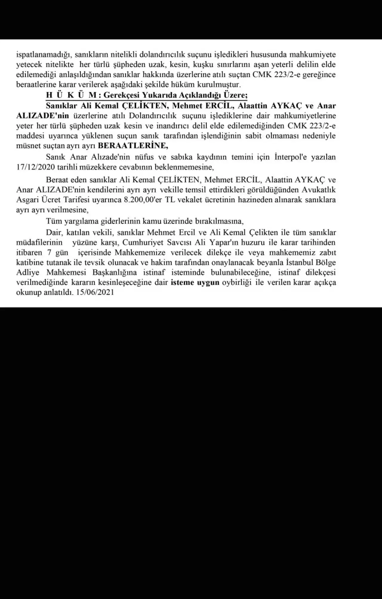 İsmail Saymaz'ın iddia ettiği dolandırıcılık iddiası İstanbul 3. Ağır Ceza Mahkemesi'nde davaya dönüşmüştü. Mahkeme, 2019/542 Esas ve 2021/290 Karar Sayılı 15 Haziran 2021 tarihli Kararında Ali Kemal Çelikten, Anar Alızade, Mehmet Erbil ve Alaattin Aykaç'ın beraatine karar vermiş.