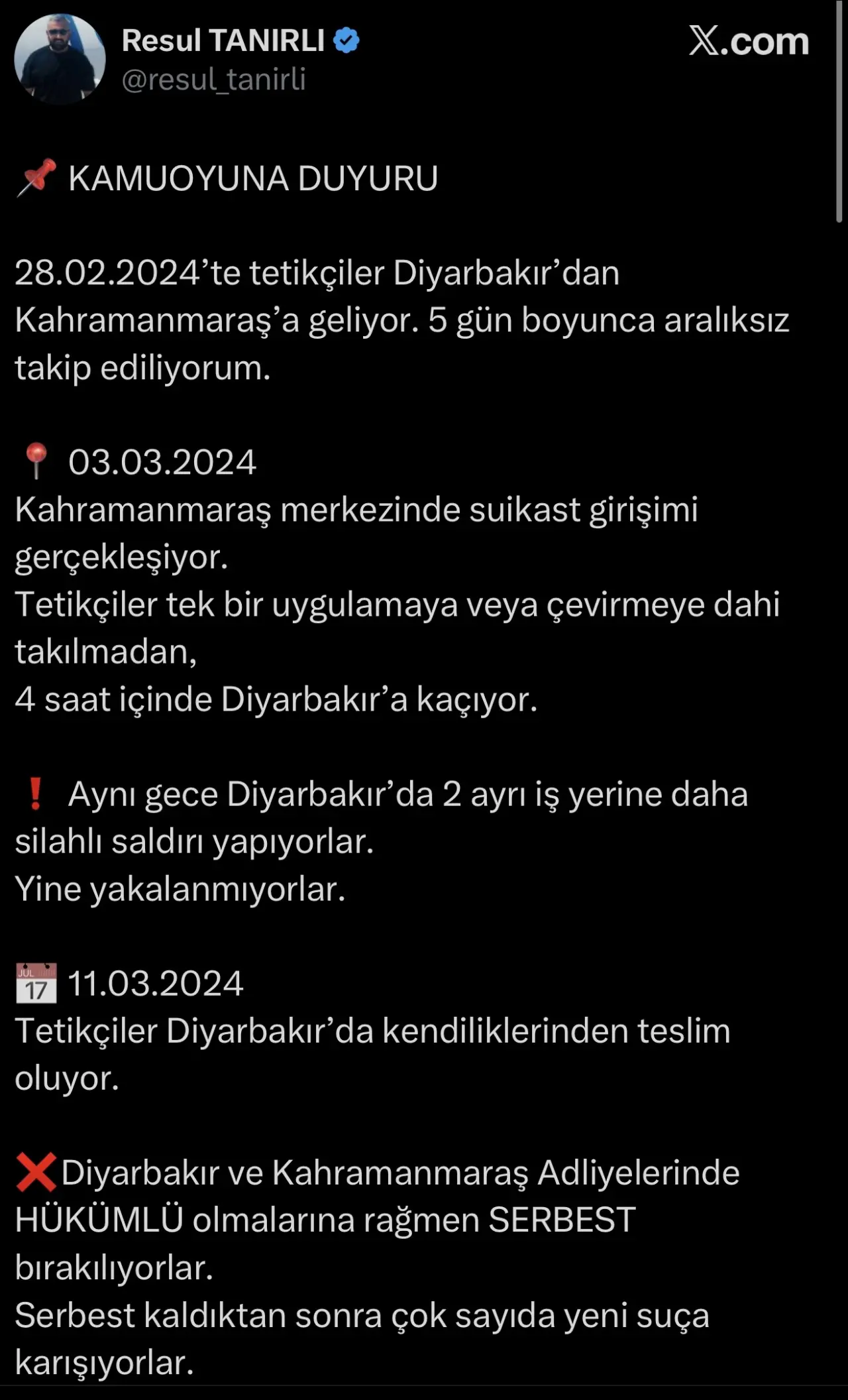 -Tarafıma gerçekleştirilen 03.03.2024 tarihinde ki suikast girişiminde HÜKÜMLÜ tetikçi ve suç ortakları Kahramanmaraş ve Diyarbakır Cumhuriyet Başsavcılığı tarafından  11.03.2024 tarihinde aynı gün senkronize şekilde serbest bırakılmışlardır.