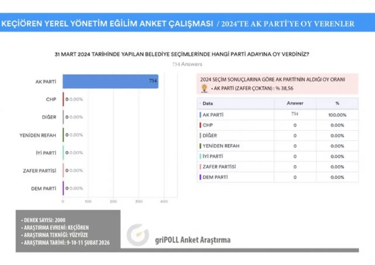 Öte yandan,Keçiören'de 2000 denek ile yüz yüze görüşme metoduyla 9-1-11 Şubat 2026 tarihlerinde yapılan anket çalışmasında çarpıcı verilerden biri de,AK Parti'ye oy verdiğini söyleyen seçmenin eğilimiydi.