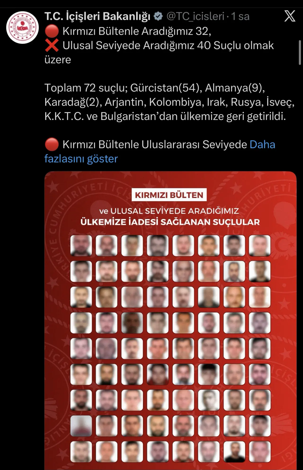 Kırmızı bültenle uluslararası seviyede aranan 32 ve ulusal seviyede aranan 40 suçlu olmak üzere toplam 72 kişi, farklı ülkelerde yakalanarak Türkiye’ye getirildi. Operasyonlar, Emniyet Genel Müdürlüğü ve ilgili kurumların uluslararası iş birliğiyle gerçekleştirildi. Yurt dışına kaçan ve haklarında yakalama kararı bulunan suçluların izini süren Türk güvenlik birimleri önemli bir operasyona imza attı. Emniyet Genel Müdürlüğü Interpol–Europol Daire Başkanlığı koordinasyonunda yürütülen çalışmalar kapsamında, farklı ülkelerde yakalanan toplam 72 suçlunun Türkiye’ye iadesi sağlandı.
