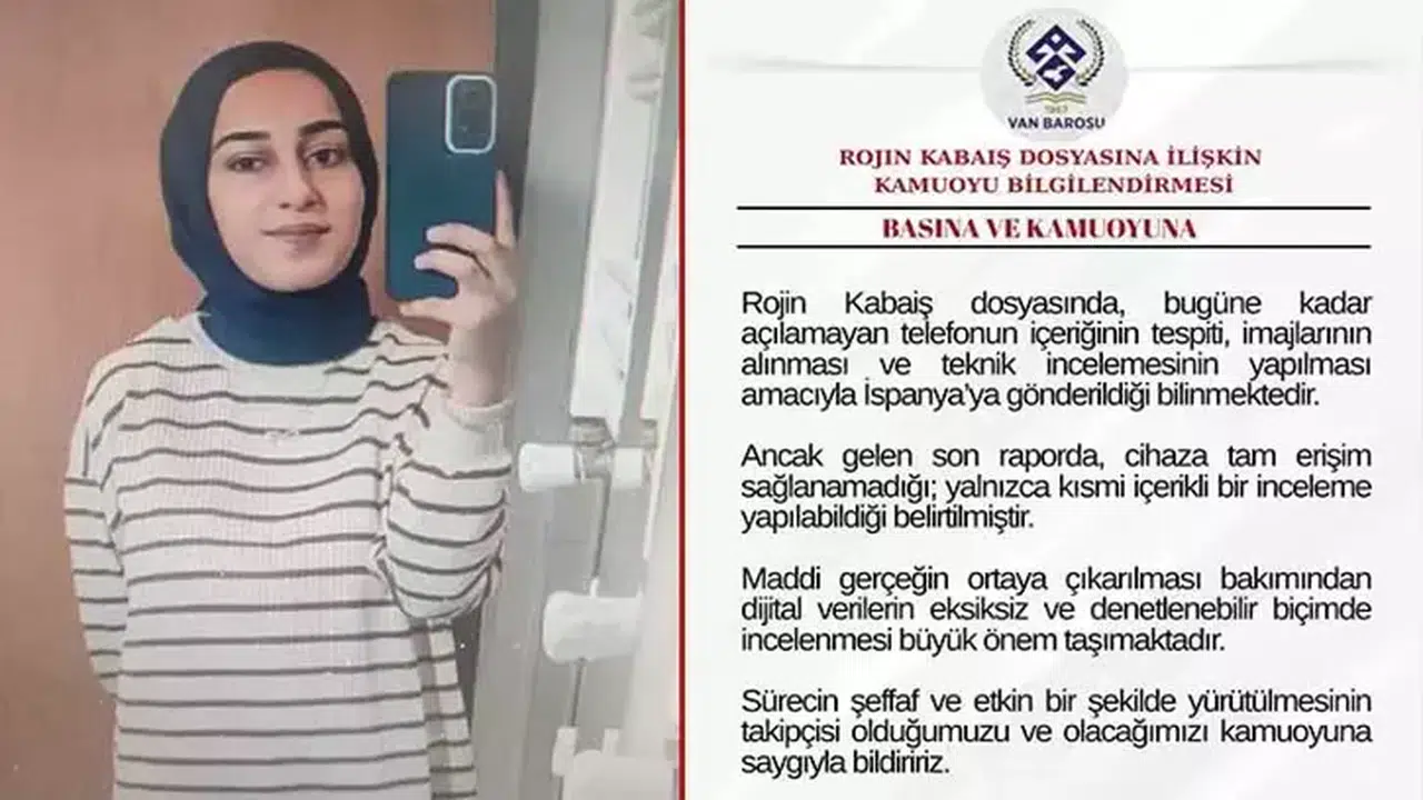 Van Baro Başkanlığı, Rojin'in incelemeye gönderilen cep telefonuna ilişkin açıklama yaptı. Açıklamada, "Rojin Kabaiş dosyasında, bugüne kadar açılamayan cep telefonunun içeriğinin tespiti, imajlarının alınması ve teknik incelemesinin yapılması amacıyla İspanya'ya gönderildiği bilinmektedir. Ancak gelen son raporda, cihaza tam erişim sağlanamadığı, yalnızca kısmi içerikli bir inceleme yapılabildiği belirtilmiştir. Maddi gerçeğin ortaya çıkarılması bakımından dijital verilerin eksiksiz ve denetilebilir biçimde incelenmesi büyük önem taşımaktadır. Sürecin şeffaf ve etkin bir biçimde yürütebilmesinin takipçisi olduğumuzu ve olacağımızı kamuoyuna saygıyla bildiririz." denildi.