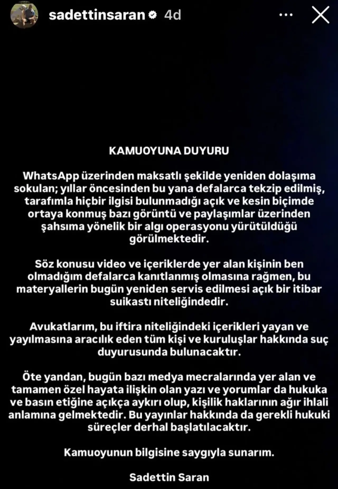“WhatsApp üzerinden maksatlı şekilde yeniden dolaşıma sokulan; yıllar öncesinden bu yana defalarca tekzip edilmiş,tarafımla hiçbir ilgisi bulunmadığı açık ve kesin biçimde ortaya konmuş bazı görüntü ve paylaşımlar üzerinden şahsıma yönelik bir algı operasyonu yürütüldüğü görülmektedir.”