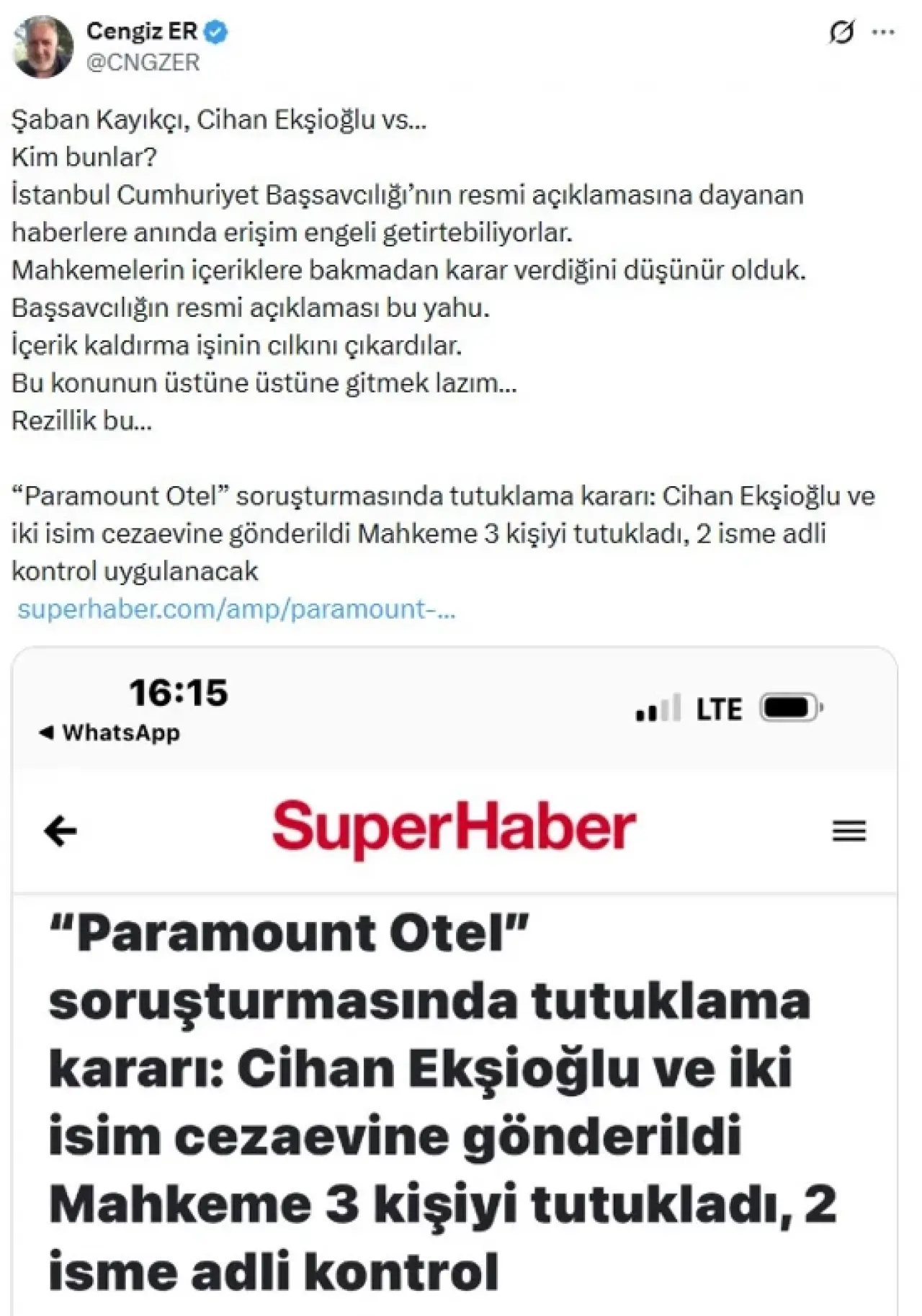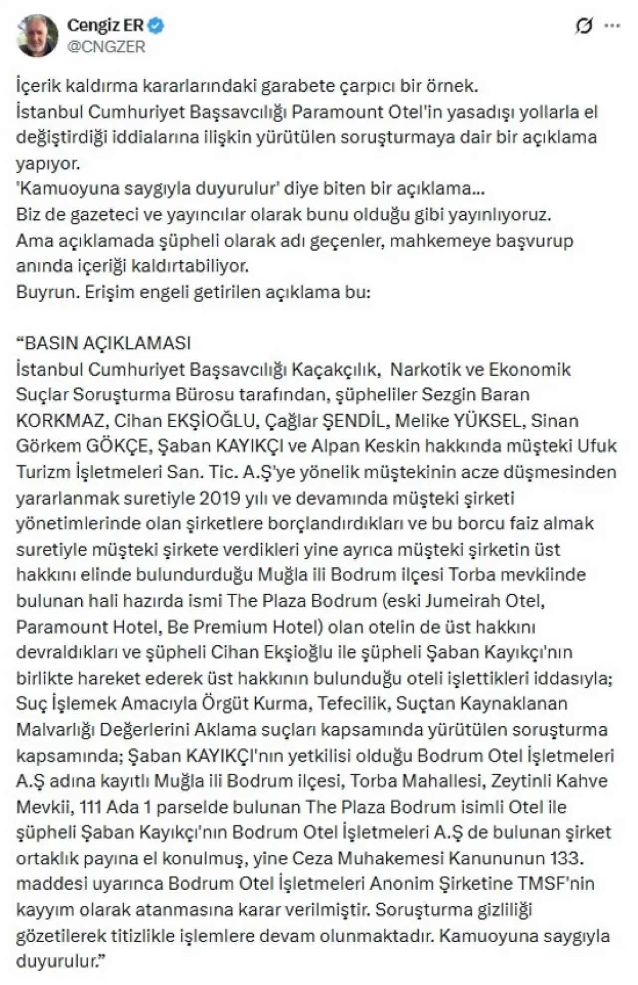 SüperHaber kurucusu gazeteci Cengiz Er, alınan bu karara X hesabı üzerinden tepki gösterdi.