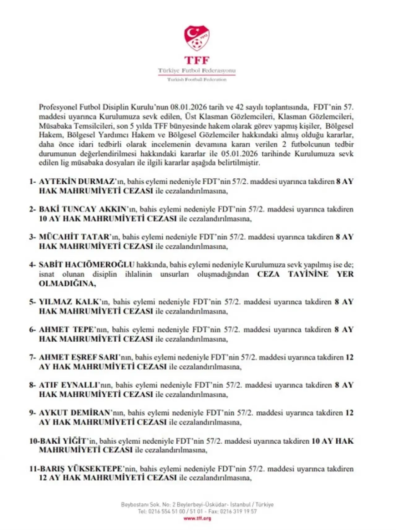 Listedeki tanıdık isimlerden Baki Tuncay Akkın'ın 10 ay hak mahrumiyeti cezası aldığı görüldü.