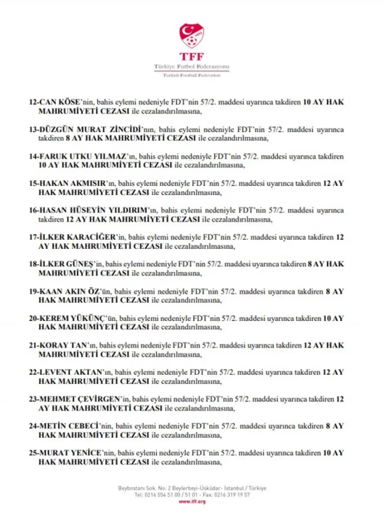 Not: Listedeki tüm isimleri TFF'nin resmi internet sitesinden ulaşabilirsiniz.