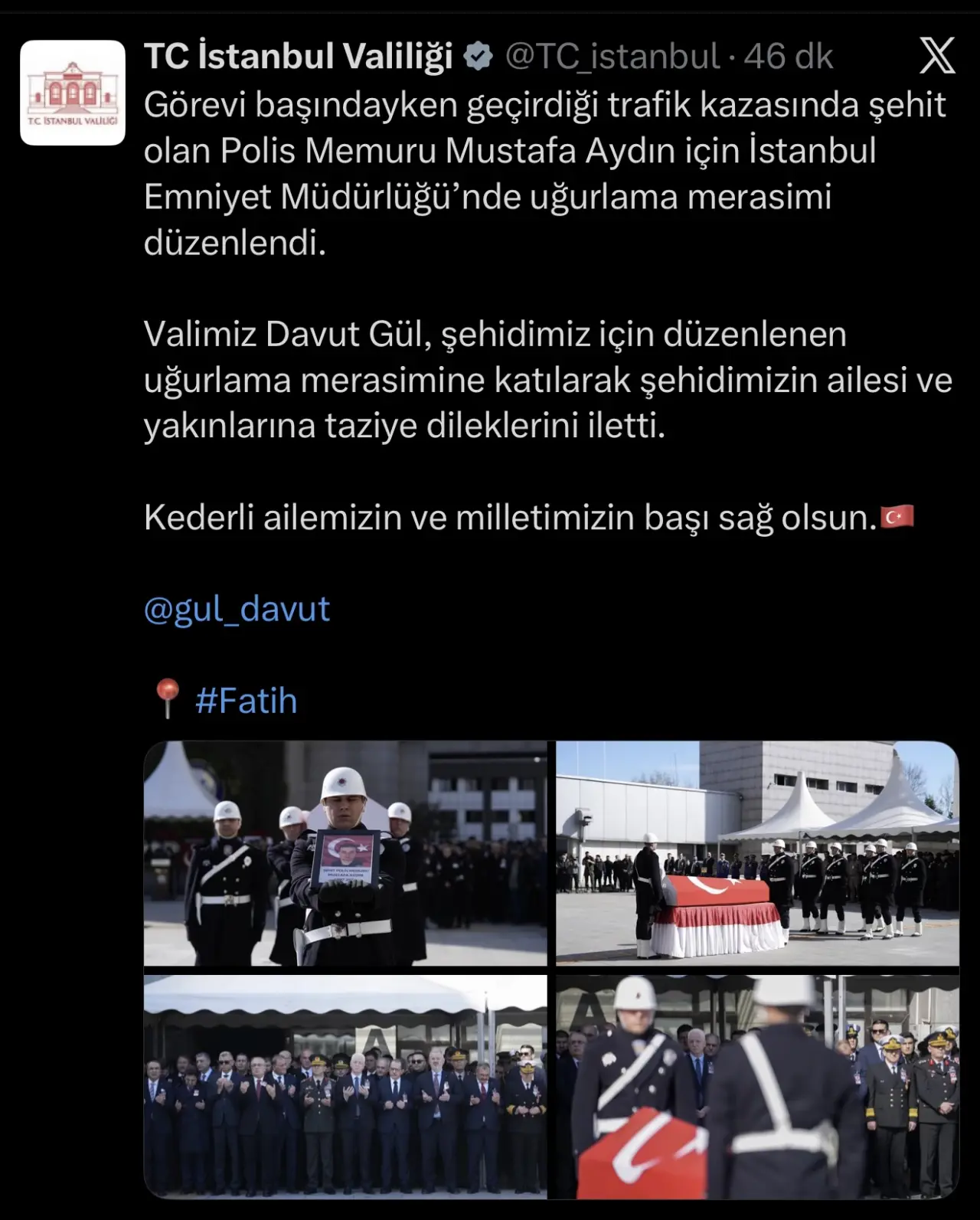 Törende bir konuşma yapan İstanbul Emniyet Müdürü Selami Yıldız, "Bugün kahraman meslektaşımız, şehidimiz Mustafa Aydın’ı son yolculuğuna uğurluyoruz. Rabbim mekanını cennet, makamını ali eylesin. Başta yüreği yanan kıymetli ailesine, tüm yakınlarına, kahraman teşkilatımıza ve aziz milletimize başsağlığı diliyorum. Personelimizi görev çıkışında ikametlerine götürmekte olan aracın karıştığı bu elim kaza hepimizi derinden sarsmış, teşkilatımızın yüreğine ateş düşürmüştür. Şehidimiz, görevine başladığı ilk günden itibaren devletine, milletine ve teşkilatına büyük bir sadakatle hizmet etmiştir. Sorumluluk bilinci ve çalışkanlığıyla örnek duruşuyla her zaman takdir kazanmıştır. Bizler biliyoruz ki bu topraklar sıradan toprak değildir; her karışı şehitlerimizin emanetidir; her bir karışı, bir fedakarlığın ve bir adanmışlığın izlerini taşır. Başta Şehit polis memurumuz Mustafa Aydın olmak üzere, vatan uğruna toprağa düşmüş tüm şehitlerimizi rahmet ve minnetle; gazilerimizi saygıyla yad ediyorum. Milletimizin başı sağolsun" diye konuştu.Konuşmaların ardından şehit polis memuru için dua edildi. Törenin ardından şehidin cenazesi, cenaze namazının kılınacağı Fatih Camii'ne götürüldü.