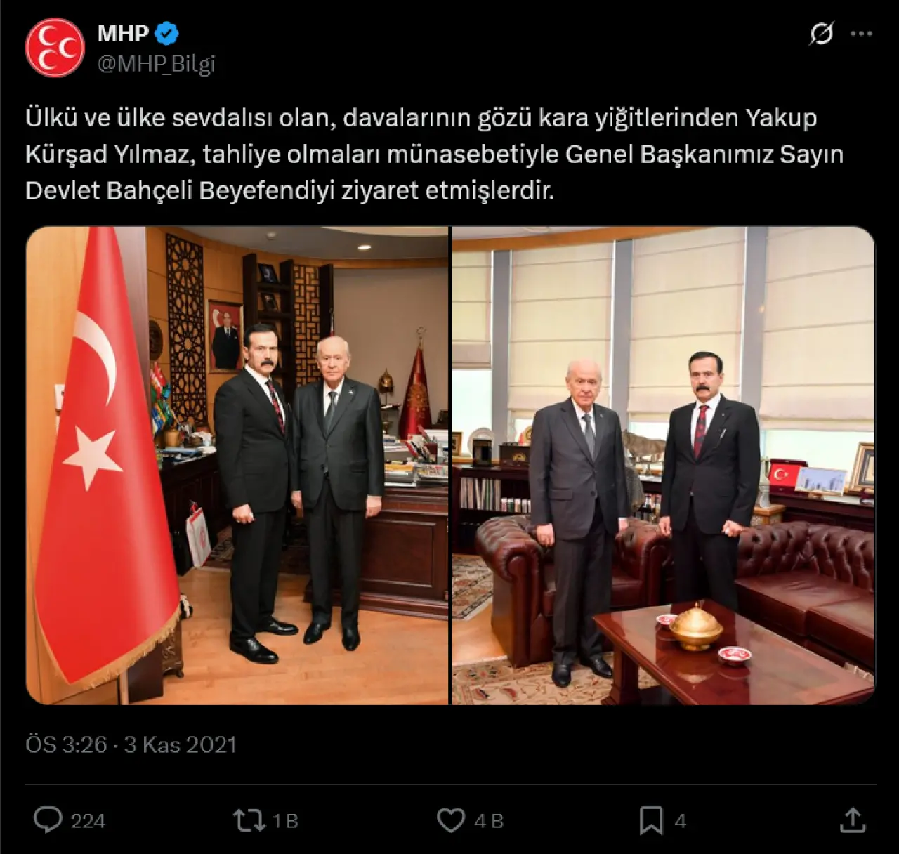 Yakup Kürşad Yılmaz, tahliye olmasının ardından, MHP Genel Merkezi’ne giderek Genel Başkan Devlet Bahçeli’yi ziyaret etti.Ziyaret MHP'nin resmi Twitter hesabından “Ülkü ve ülke sevdalısı olan, davalarının gözü kara yiğitlerinden Yakup Kürşad Yılmaz... Sayın Devlet Bahçeli Beyefendiyi ziyaret etmişlerdir" notuyla paylaşıldı.Devlet Bahçeli'yi bu ziyaretinden sonra bir çok kez yine ziyaret eden Yılmaz,sosyal medya hesabı üzerinden bu ziyaretlerini paylaşmıştı.