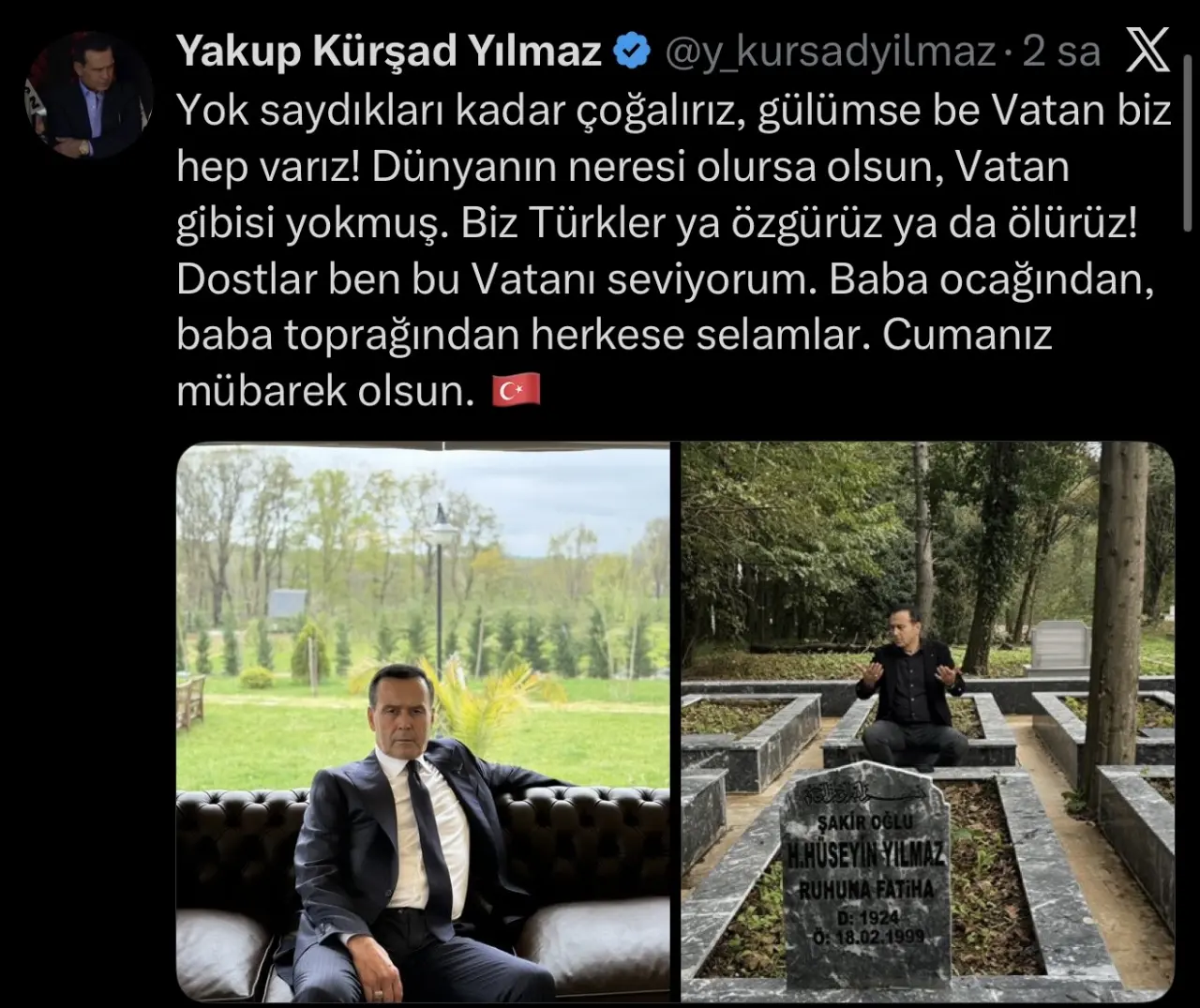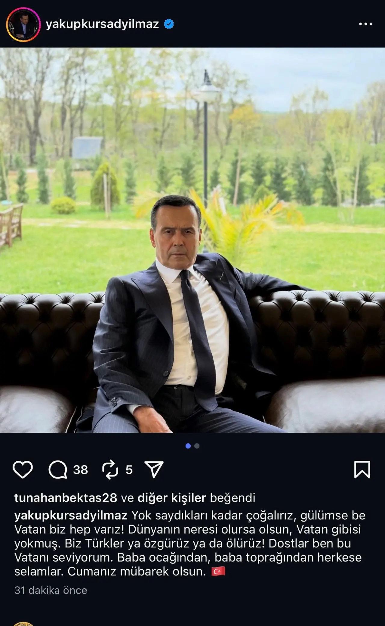 Yakup Kürşad Yılmaz'ın paylaşımı ise şöyle; “Yok saydıkları kadar çoğalırız, gülümse be vatan biz hep varız! Dünyanın neresi olursa olsun, vatan gibi yokmuş. Biz Türkler ya özgürüz, ya da ölürüz! Dostlar ben bu vatanı seviyorum. Baba ocağından, baba toprağından herkese selamlar.Cumanız mübarek olsun.”