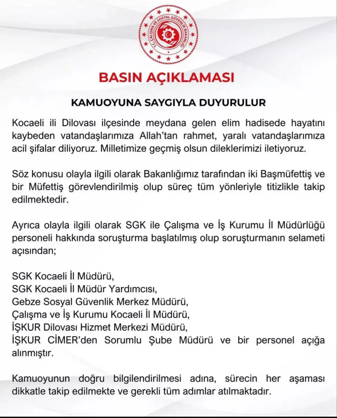 Çalışma ve Sosyal Güvenlik Bakanlığı, Kocaeli'nin Dilovası ilçesinde meydana gelen yangınla ilgili SGK Kocaeli İl Müdürü, SGK Kocaeli İl Müdürü Yardımcısı, Gebze Sosyal Güvenlik Merkez Müdürü, Çalışma ve İş Kurumu Kocaeli İl Müdürü, İŞKUR Dilovası Hizmet Merkezi Müdürü, İŞKUR CİMER’den sorumlu şube müdürü ve bir personelin açığa alındığını açıkladı.