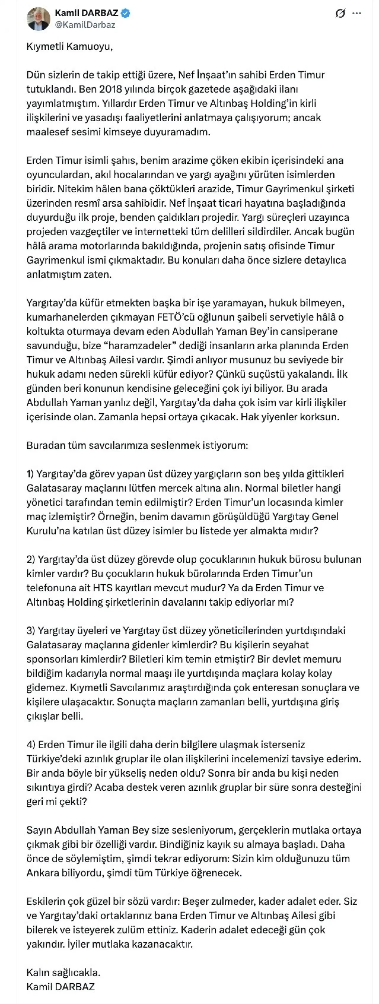 İş insanı Kamil Darbaz Nef İnşaat’ın sahibi Erden Timur’un tutuklanmasının ardından kamuoyuna yaptığı açıklamada, yıllardır kendisine ait bir araziye “çöküldüğünü” iddia etti. Darbaz, Erden Timur ve Altınbaş Holding’i hedef alarak yargı, spor ve iş dünyası üzerinden kurulduğunu öne sürdüğü ilişkiler ağına dikkat çekti.