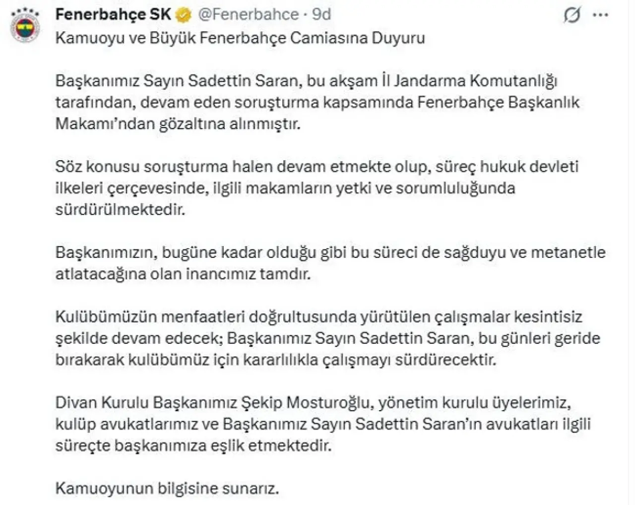 Başkanımız Sayın Sadettin Saran, bu akşam İl Jandarma Komutanlığı tarafından, devam eden soruşturma kapsamında Fenerbahçe Başkanlık Makamı’ndan gözaltına alınmıştır.