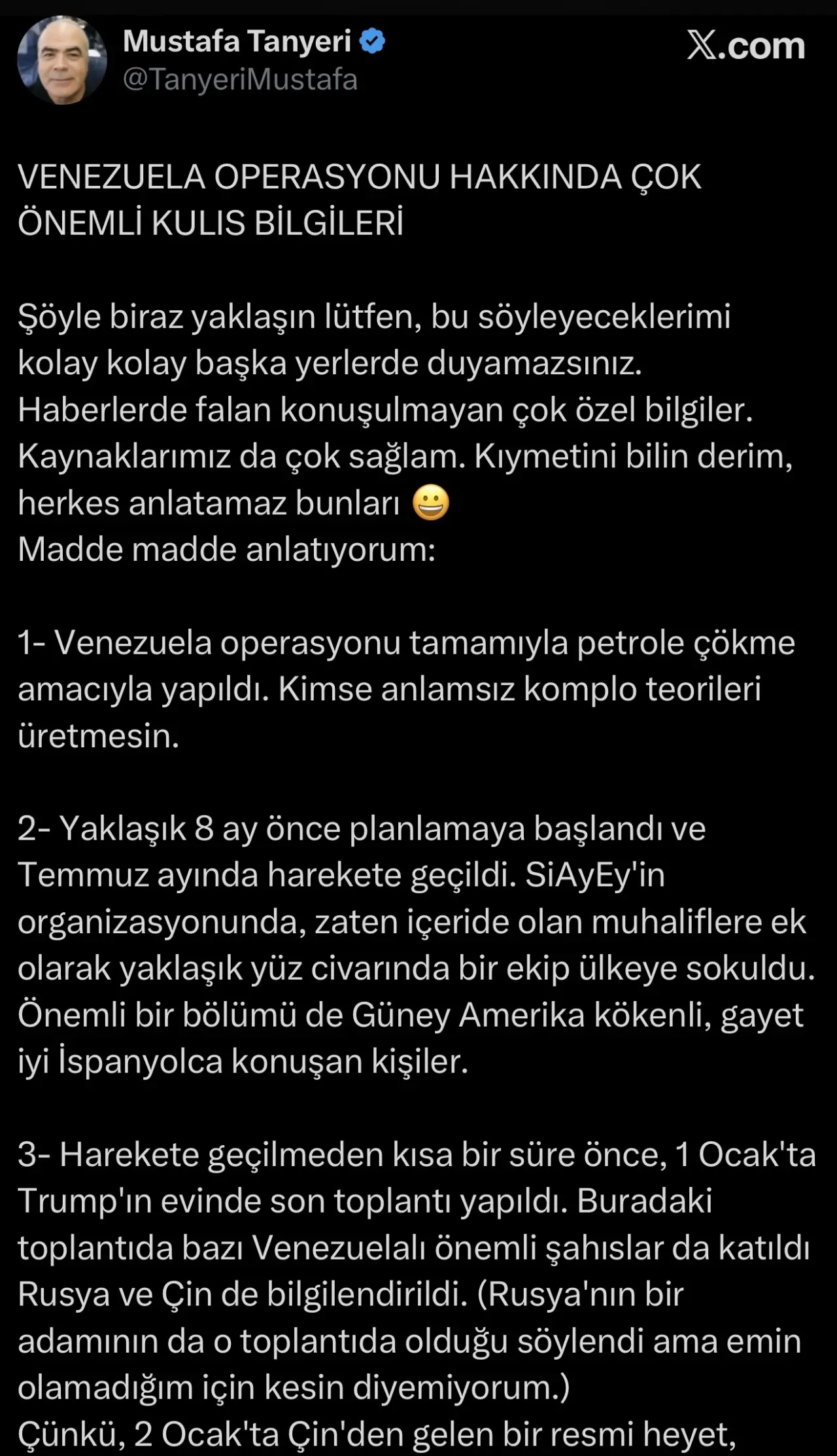 1- Venezuela operasyonu tamamıyla petrole çökme amacıyla yapıldı. Kimse anlamsız komplo teorileri üretmesin.
