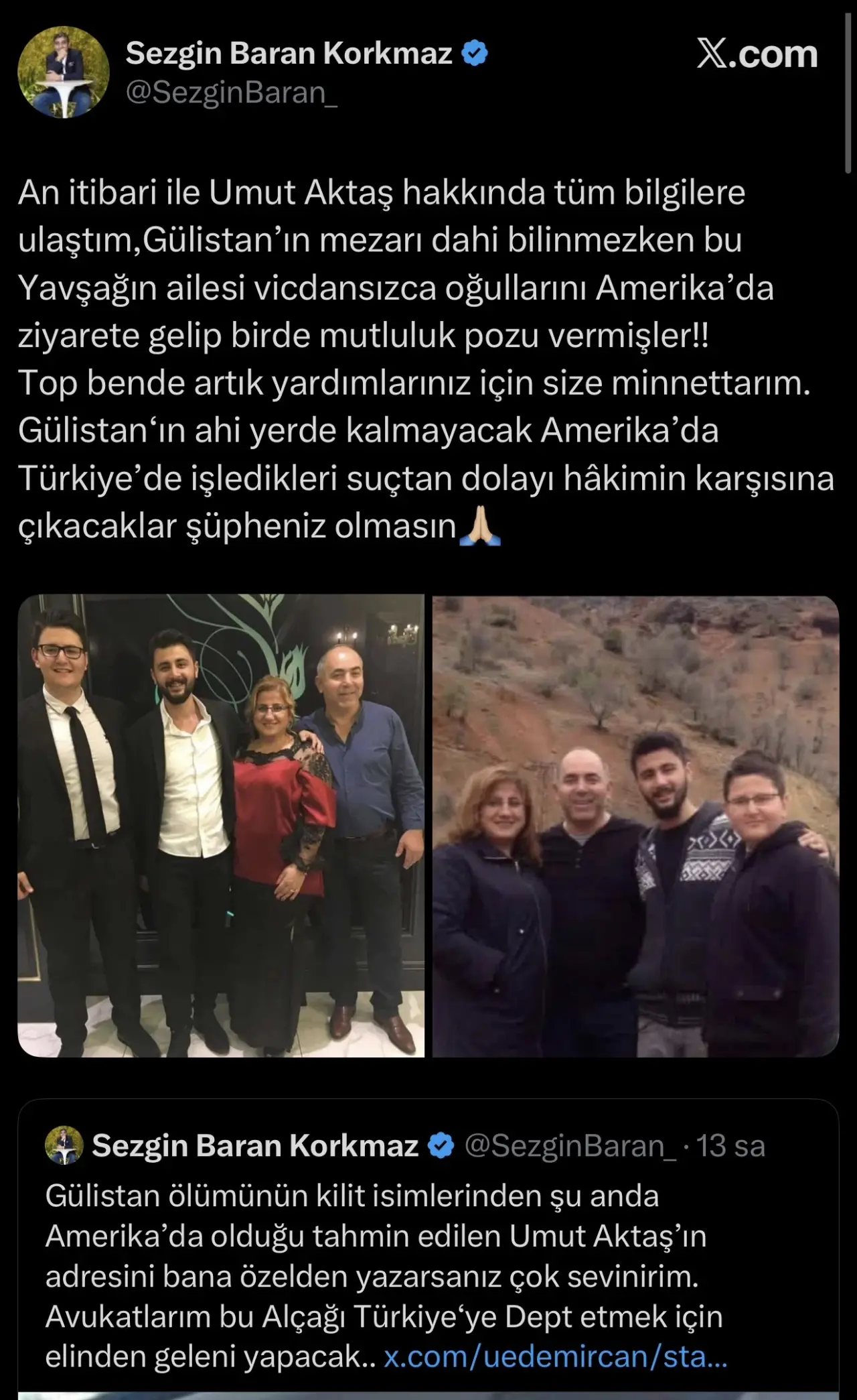 An itibari ile Umut Aktaş hakkında tüm bilgilere ulaştım, Gülistan’ın mezarı dahi bilinmezken bu yavşağın ailesi vicdansızca oğullarını Amerika’da ziyarete gelip bir de mutluluk pozu vermişler!!