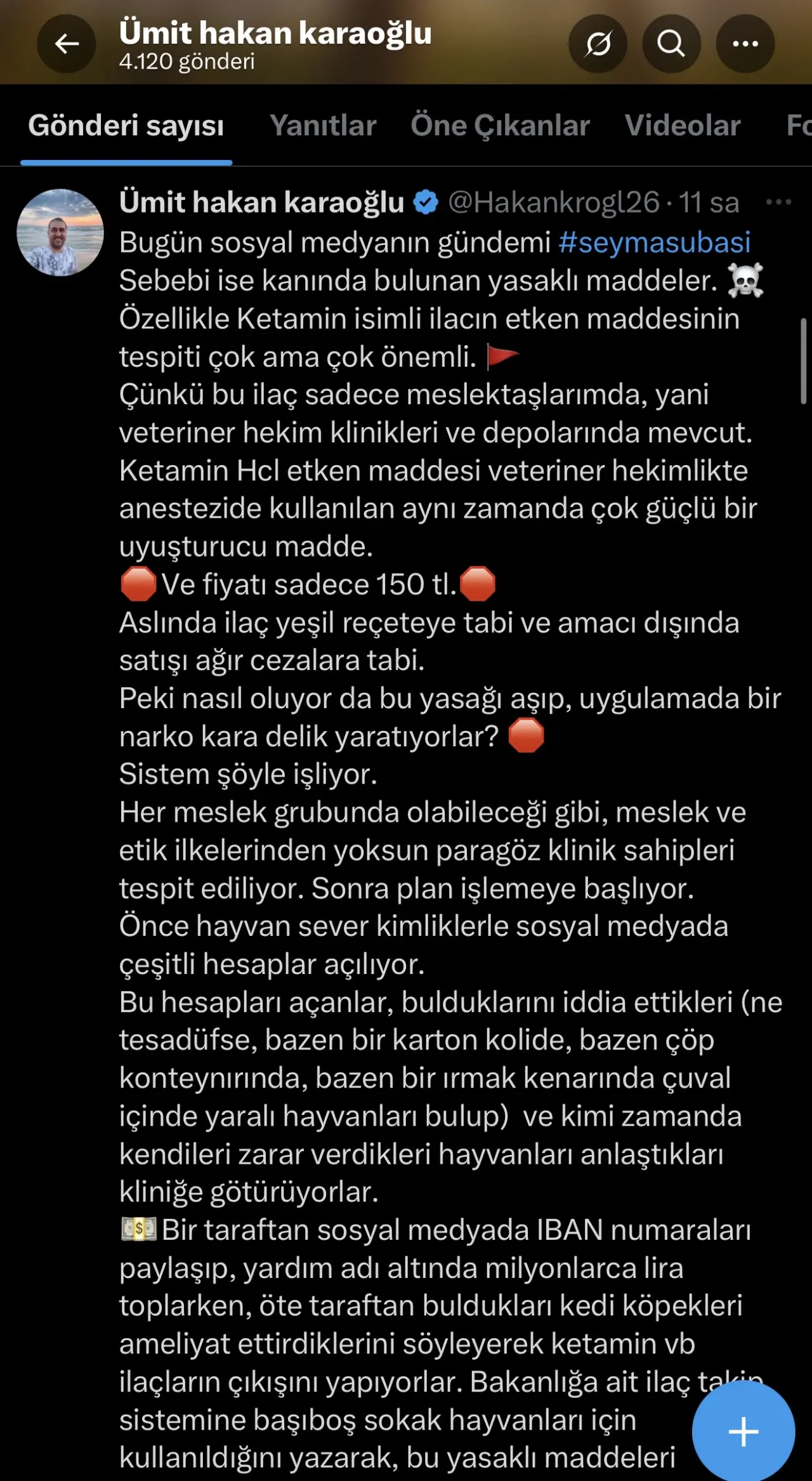 Ümit Hakan Karaoğlu,sosyal medya hesabı (X) üzerinden yaptığı korkunç açıklamada.sokak hayvanlarının kullanılarak elde edilen “ketamin” adlı uyuşturucunun nasıl elde edildiğini açıkladı.Veterşner hekim Karaoğlu’nun büyük tartışma yaratacak o çok ilginç yazısı ise şöyle;