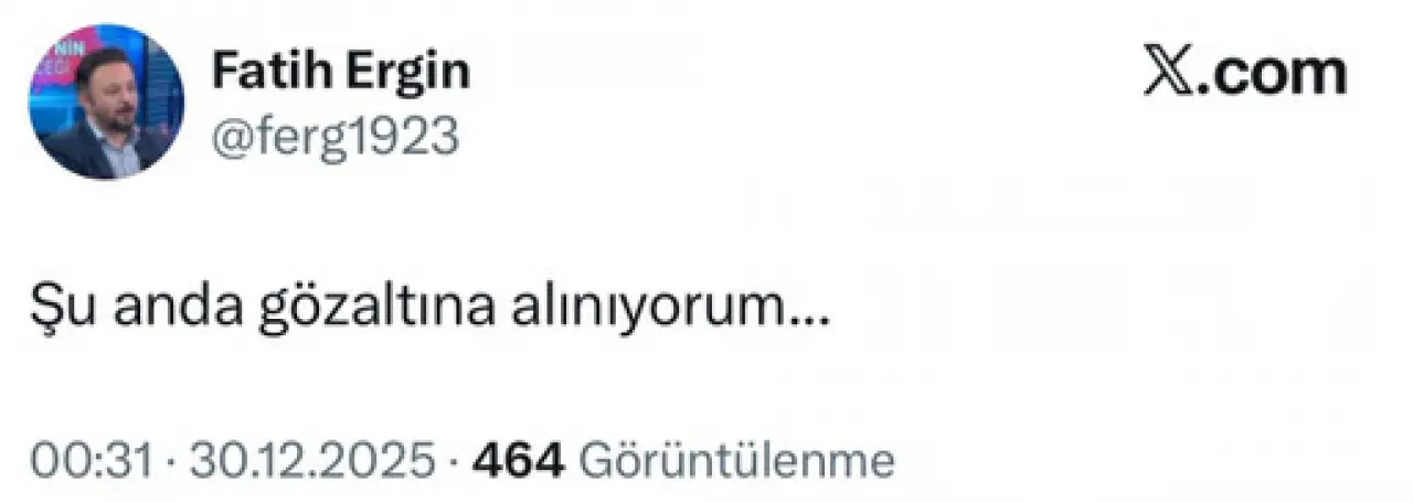 Ergin, gözaltı haberini sosyal medya hesabında duyurdu. Gece saatlerinde X hesabından paylaşımda bulunan Ergin 'Şu anda gözaltına alınıyorum...' ifadelerini kullandı.