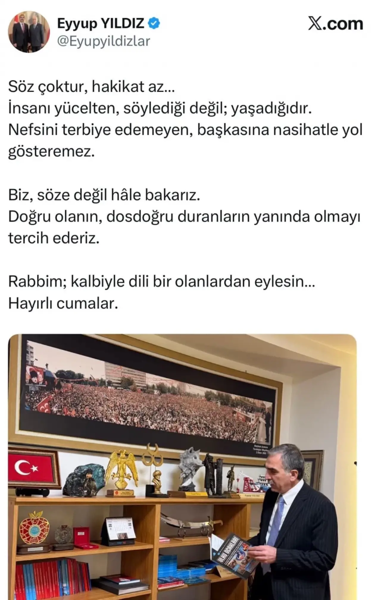 MHP Genel Başkanı Devlet Bahçeli’nin danışmanı Eyup Yıldız bugün “Biz, söze değil hâle bakarız. Doğru olanın, dosdoğru duranların yanında olmayı tercih ederiz” paylaşımı yapmıştı.
