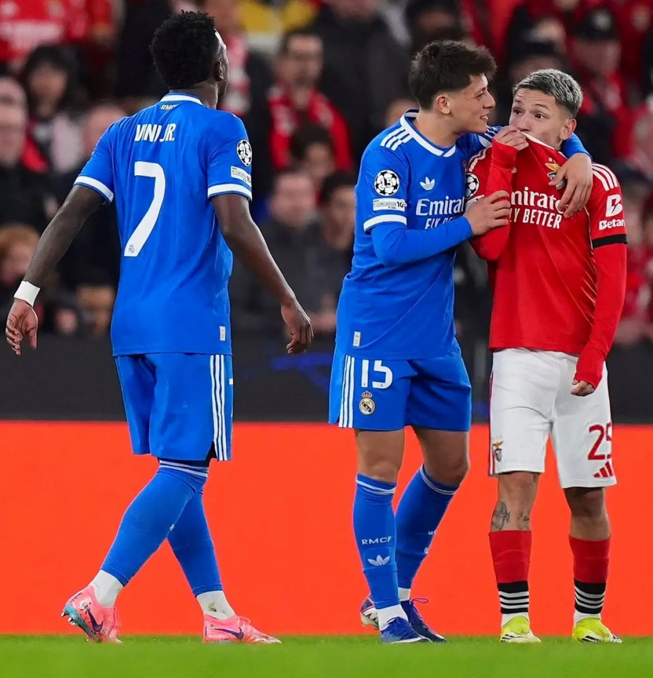 Genç futbolcunun, Prestianni’ye sarılarak tartışmayı büyümeden durdurmaya çalıştığı ve Arjantinli oyuncuyu olay yerinden uzaklaştırmaya çabaladığı görüldü. Arda’nın tavrı, sosyal medyada “sakinleştirici rol” olarak yorumlandı.