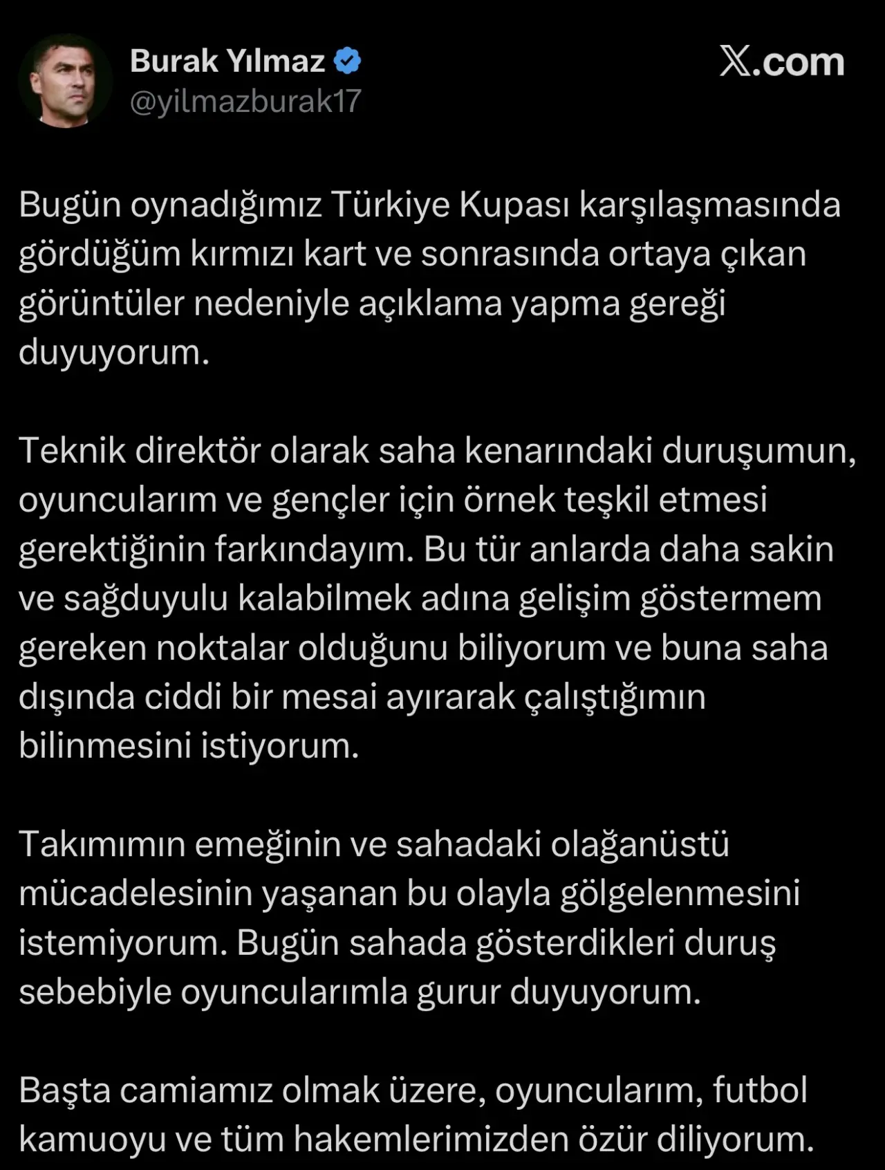 “Bugün oynadığımız Türkiye Kupası karşılaşmasında gördüğüm kırmızı kart ve sonrasında ortaya çıkan görüntüler nedeniyle açıklama yapma gereği duyuyorum.