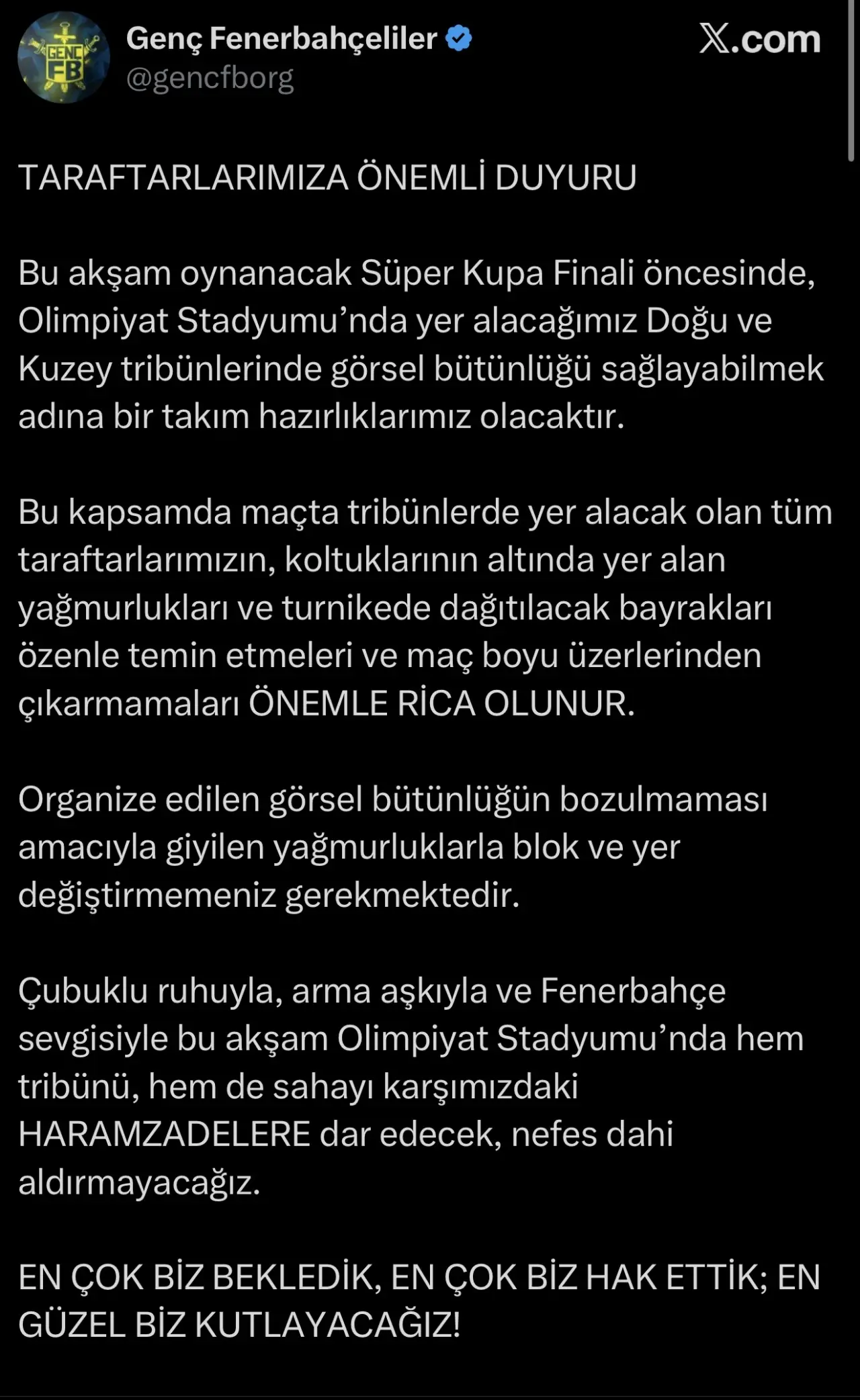 Genç Fenerbahçeliler,Süper Kupa öncesi de,kendi sosyal medya hesapları üzerinden tribünlerde düzeni sağlamak için,aşağıdaki mesajı yayımladılar.