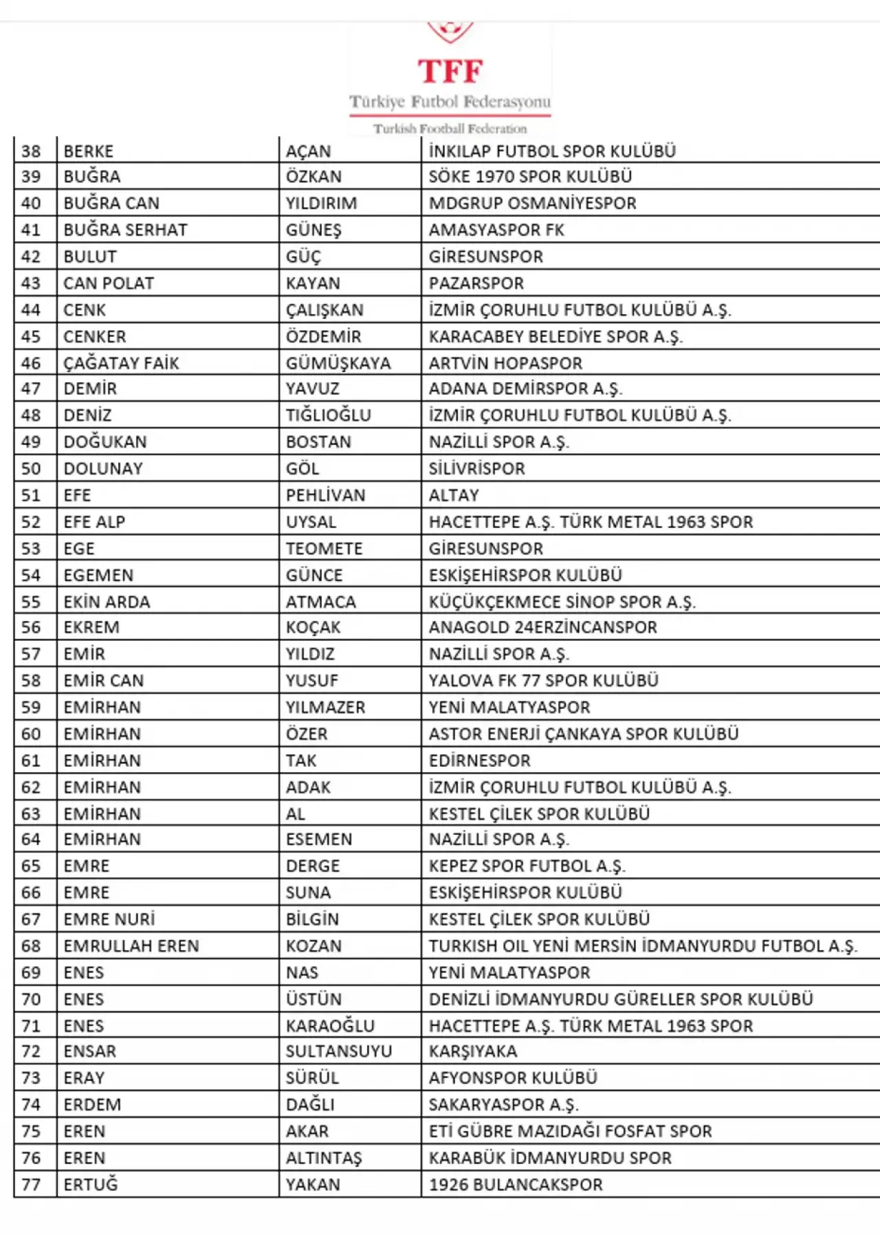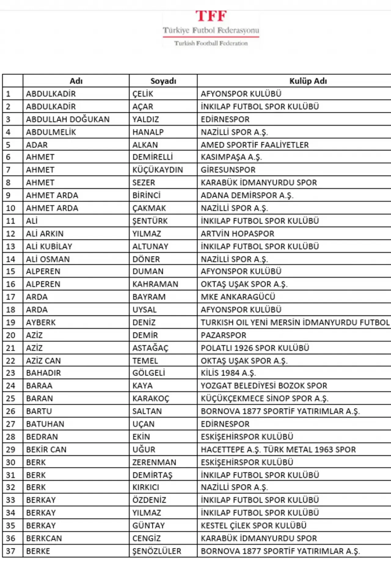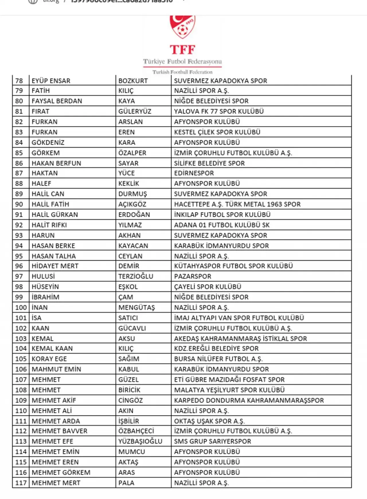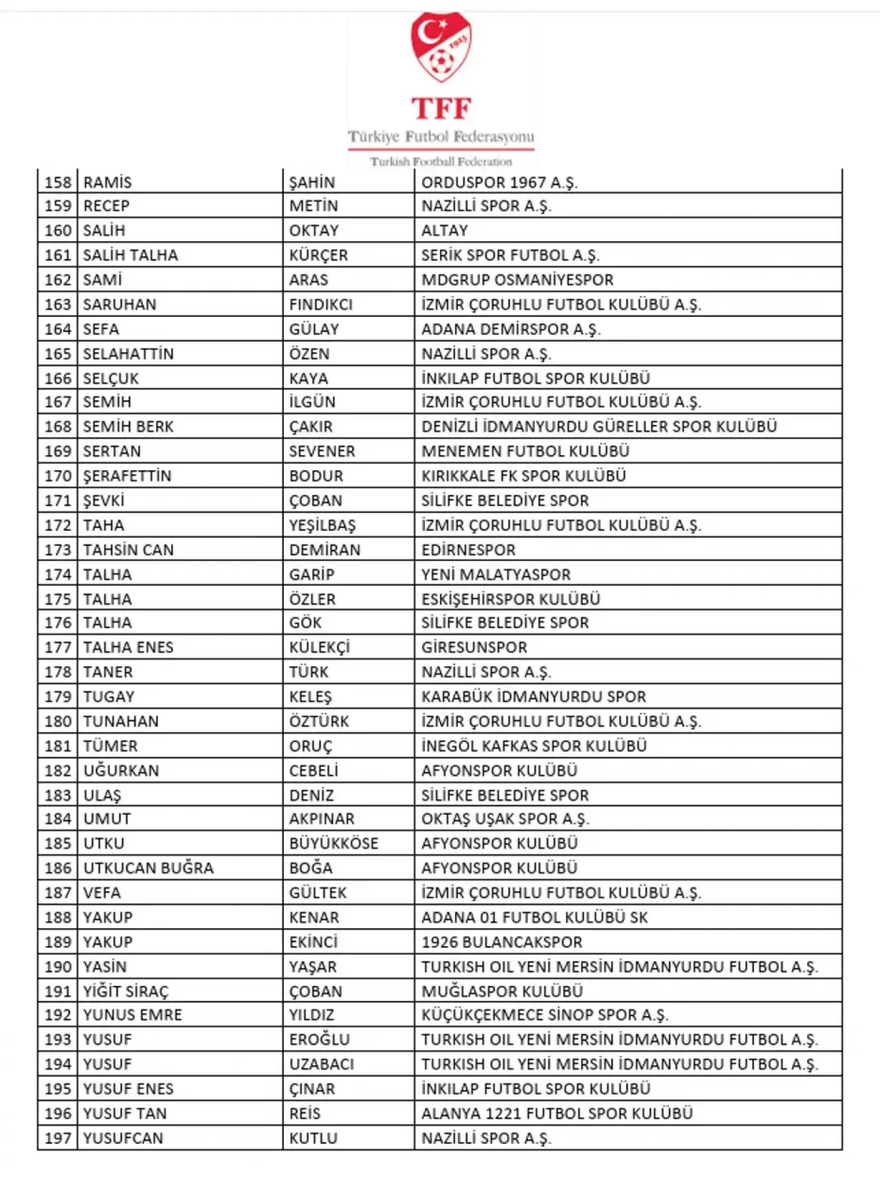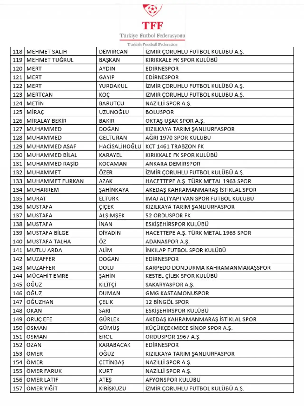 "Türkiye Futbol Federasyonu’nca profesyonel liglere yönelik olarak yürütülen bahis soruşturması kapsamında 10.11.2025 tarihinde PFDK’ya sevk edilen 1024 futbolcunun haricinde profesyonel liglerde yer alan kulüplerin “A Takım” listelerinde yer alan veya ilgili lig statüleri uyarınca esame listesine yazılarak profesyonel müsabakalarda oynatılabilen amatör statüdeki 658 futbolcudan bahis oynadığı tespit edilen aşağıdaki 197 futbolcunun Futbol Disiplin Talimatı’nın 57. maddesi uyarınca 08.12.2025 tarihinden itibaren tedbirli olarak PFDK'ya sevk edilmesine karar verilmiştir.