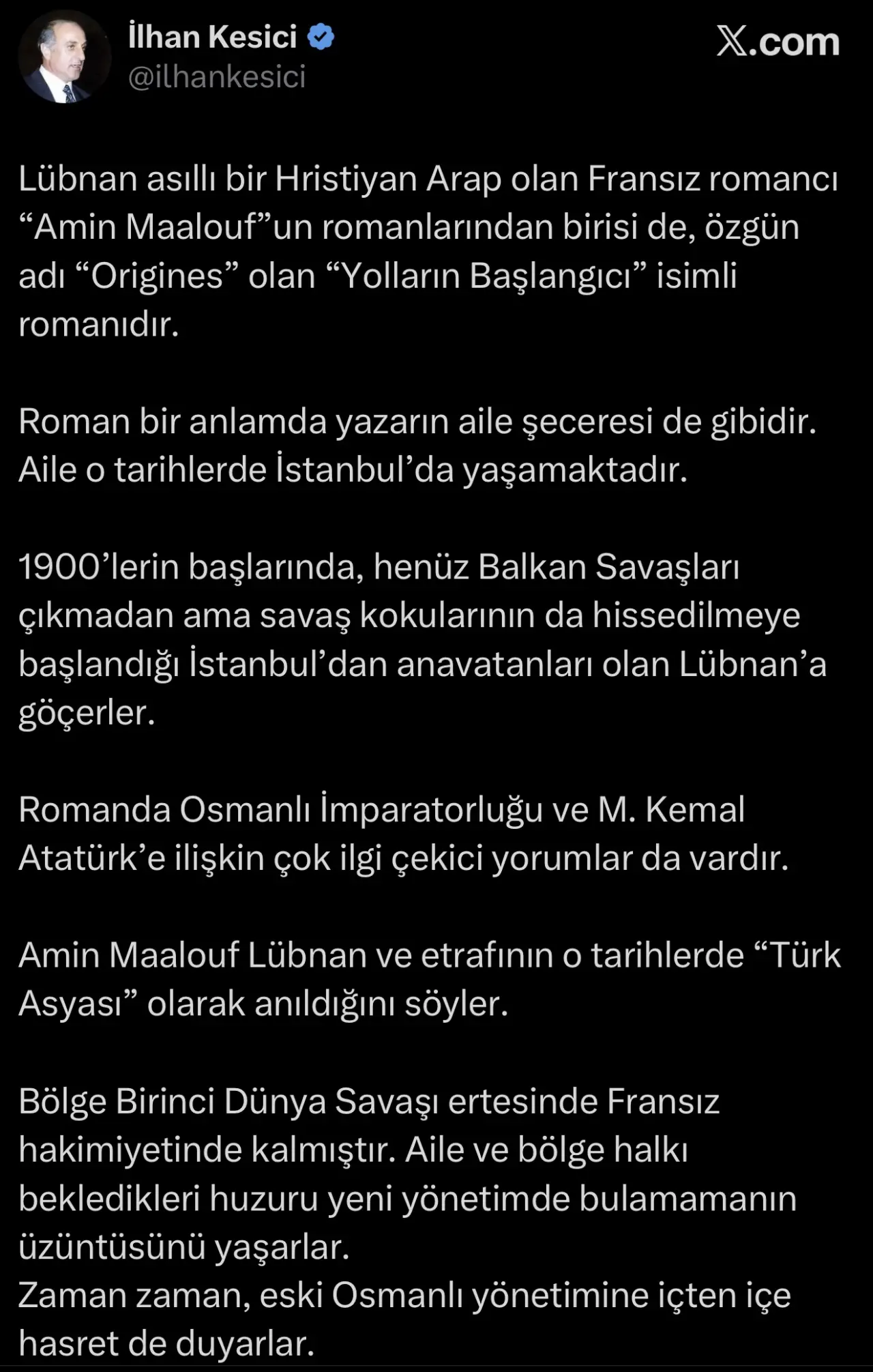 İlhan Kesici’nin sosyal medya hesabı üzerinden paylaştığı,Arap olan Fransız romancı Amin Maalouf ve Sakarya Zaferi’nin Lübnan’a kadar uzanan o ilginç anı yazısı ise şöyle;