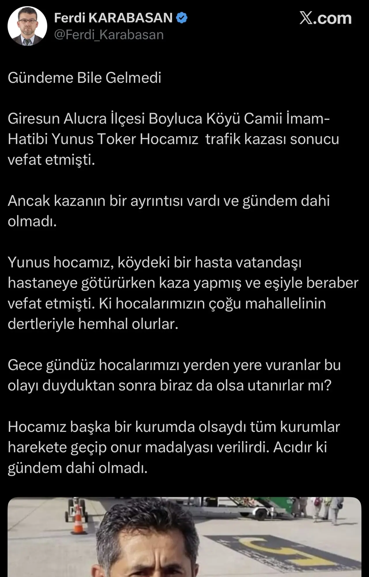 Sosyal medya kullanıcısı @Ferdi_Karabasan,”Gündeme Bile Gelmedi” başlığı ile Giresun’da görev yapan yardımsever bir imamın trafik kazası sonucu yaşamını yitirmesini şöyle yazdı.